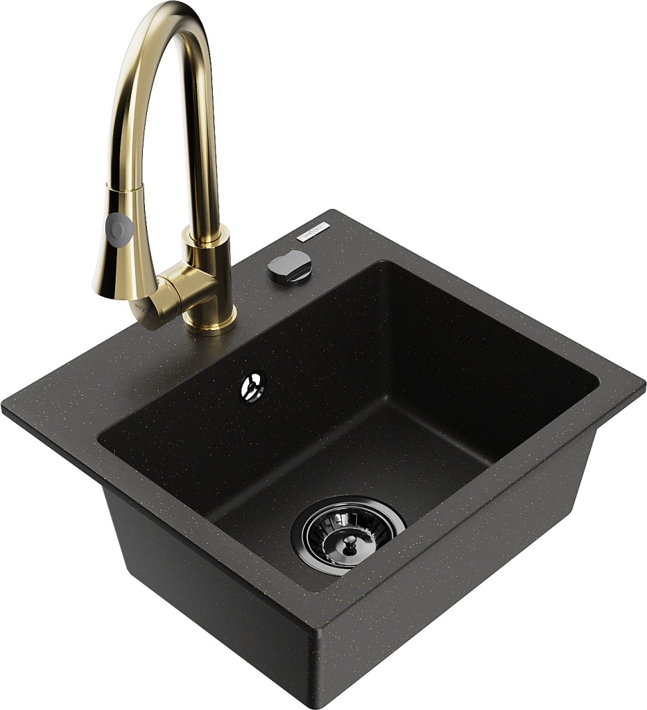 Technické dáta: drez: Rozmer: 435x410x171mm Hĺbka komory: 161 mm Rozmery komory: 375x280 mm Priemer odtoku: ø90 mm Typ: 1-komorový Typ: Zapustené do pracovnej dosky Farba: čierna / zlatá metalíza Povrchová úprava sifónu: čierna Materiál: žula (80% žulové kamenivo, 20% živice) Prepadový otvor: Áno Otvory: (batérie, automatické) 2 Vysoká odolnosť proti poškriabaniu a zmene farby Odolnosť proti tepelným šokom Ľahko čistiteľný povrch Jeden dodatočný vyfrézovaný otvor na samodierovanie ø35 kuchynská batéria: Materiál: mosadz Farba: Zlatá Hlava: Keramická Prevzdušňovač: Áno Typ: Jedna páka Výška batérie: 380 mm Rozsah výtoku: 252 mm Typ výtoku: Výsuvný(GT) Ean: 5905315028594