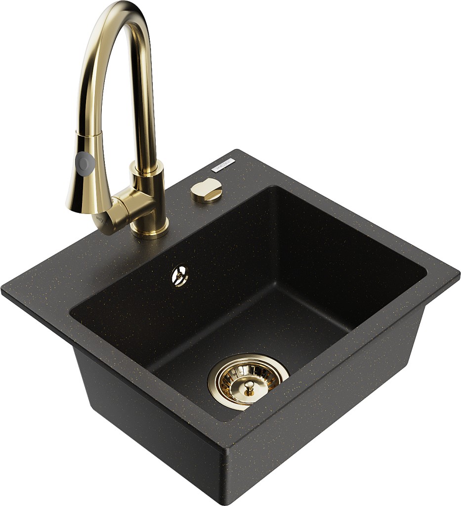 Technické dáta: drez: Rozmer: 435x410x171mm Hĺbka komory: 161 mm Rozmery komory: 375x280 mm Priemer odtoku: ø90 mm Typ: 1-komorový Typ: Zapustené do pracovnej dosky Farba: čierna / zlatá metalíza Povrchová úprava sifónu: zlatá Materiál: žula (80% žulové kamenivo, 20% živice) Prepadový otvor: Áno Otvory: (batérie, automatické) 2 Vysoká odolnosť proti poškriabaniu a zmene farby Odolnosť proti tepelným šokom Ľahko čistiteľný povrch Jeden dodatočný vyfrézovaný otvor na samodierovanie ø35 kuchynská batéria: Materiál: mosadz Farba: Zlatá Hlava: Keramická Prevzdušňovač: Áno Typ: Jedna páka Výška batérie: 380 mm Rozsah výtoku: 252 mm Typ výtoku: Výsuvný(GT) Ean: 5905315028587