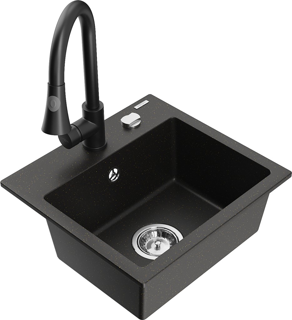 Technické dáta: drez: Rozmer: 435x410x171mm Hĺbka komory: 161 mm Rozmery komory: 375x280 mm Priemer odtoku: ø90 mm Typ: 1-komorový Typ: Zapustené do pracovnej dosky Farba: čierna / zlatá metalíza Povrchová úprava sifónu: Chrome Materiál: žula (80% žulové kamenivo, 20% živice) Prepadový otvor: Áno Otvory: (batérie, automatické) 2 Vysoká odolnosť proti poškriabaniu a zmene farby Odolnosť proti tepelným šokom Ľahko čistiteľný povrch Jeden dodatočný vyfrézovaný otvor na samodierovanie ø35 kuchynská batéria: Materiál: mosadz Čierna farba Hlava: Keramická Prevzdušňovač: Áno Typ: Jedna páka Výška batérie: 380 mm Rozsah výtoku: 252 mm Typ výtoku: Výsuvný(GT) Ean: 5905315028617