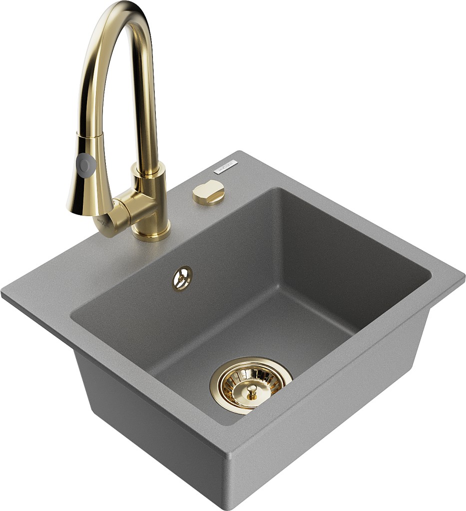 Technické dáta: drez: Rozmer: 435x410x171mm Hĺbka komory: 161 mm Rozmery komory: 375x280 mm Priemer odtoku: ø90 mm Typ: 1-komorový Typ: Zapustené do pracovnej dosky Šedá farba Povrchová úprava sifónu: zlatá Materiál: žula (80% žulové kamenivo, 20% živice) Prepadový otvor: Áno Otvory: (batérie, automatické) 2 Vysoká odolnosť proti poškriabaniu a zmene farby Odolnosť proti tepelným šokom Ľahko čistiteľný povrch Jeden dodatočný vyfrézovaný otvor na samodierovanie ø35 kuchynská batéria: Materiál: mosadz Farba: Zlatá Hlava: Keramická Prevzdušňovač: Áno Typ: Jedna páka Výška batérie: 380 mm Rozsah výtoku: 252 mm Typ výtoku: Výsuvný(GT) Ean: 5905315028495