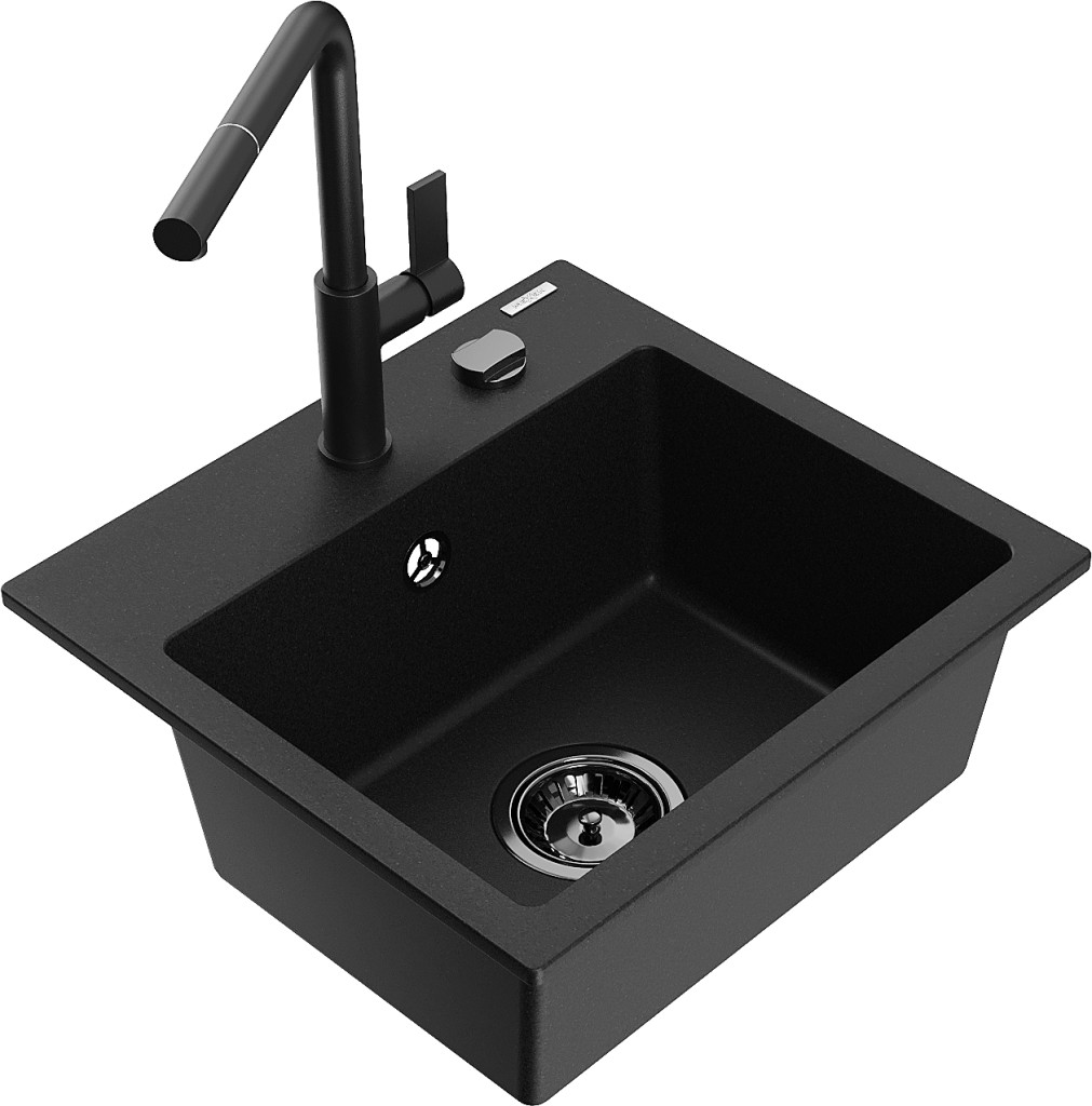 Technické dáta: drez: Rozmer: 435x410x171mm Hĺbka komory: 161 mm Rozmery komory: 375x280 mm Priemer odtoku: ø90 mm Typ: 1-komorový Typ: Zapustené do pracovnej dosky Čierna farba Povrchová úprava sifónu: čierna Materiál: žula (80% žulové kamenivo, 20% živice) Prepadový otvor: Áno Otvory: (batérie, automatické) 2 Vysoká odolnosť proti poškriabaniu a zmene farby Odolnosť proti tepelným šokom Ľahko čistiteľný povrch Jeden dodatočný vyfrézovaný otvor na samodierovanie ø35 kuchynská batéria: Materiál: mosadz Čierna farba Hlava: Keramická Prevzdušňovač: Áno Typ: Jedna páka Rozsah výtoku: 245 mm Výška batérie: 307 mm(GT) Ean: 5905315058447