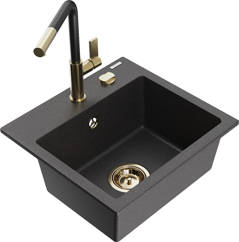 Technické dáta: drez: Rozmer: 435x410x171mm Hĺbka komory: 161 mm Rozmery komory: 375x280 mm Priemer odtoku: ø90 mm Typ: 1-komorový Typ: Zapustené do pracovnej dosky Farba: Škvrnitá čierna Povrchová úprava sifónu: zlatá Materiál: žula (80% žulové kamenivo, 20% živice) Prepadový otvor: Áno Otvory: (batérie, automatické) 2 Vysoká odolnosť proti poškriabaniu a zmene farby Odolnosť proti tepelným šokom Ľahko čistiteľný povrch Jeden dodatočný vyfrézovaný otvor na samodierovanie ø35 kuchynská batéria: Materiál: mosadz Farba: Zlatá/Čierna Hlava: Keramická Prevzdušňovač: Áno Typ: Jedna páka Rozsah výtoku: 245 mm Výška batérie: 307 mm(GT) Ean: 5905315058348