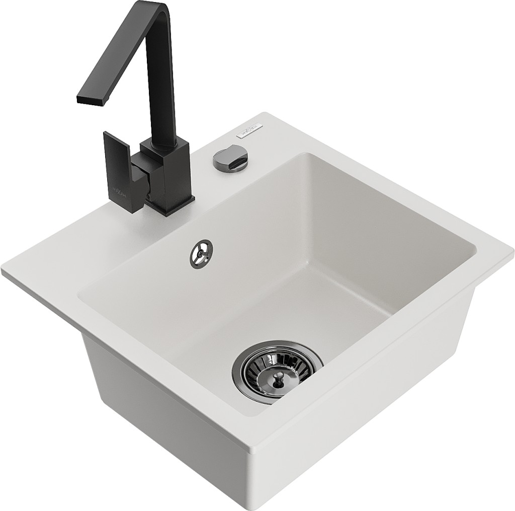 Technické dáta: drez: Rozmer: 435x410x171mm Hĺbka komory: 161 mm Rozmery komory: 375x280 mm Priemer odtoku: ø90 mm Typ: 1-komorový Typ: Zapustené do pracovnej dosky biela farba Povrchová úprava sifónu: čierna Materiál: žula (80% žulové kamenivo, 20% živice) Prepadový otvor: Áno Otvory: (batérie, automatické) 2 Vysoká odolnosť proti poškriabaniu a zmene farby Odolnosť proti tepelným šokom Ľahko čistiteľný povrch Jeden dodatočný vyfrézovaný otvor na samodierovanie ø35 kuchynská batéria: Materiál: mosadz Čierna farba Hlava: Keramická Prevzdušňovač: Áno Typ: Jedna páka Výška batérie: 290 mm Rozsah výtoku: 220 mm(GT) Ean: 5905315018205
