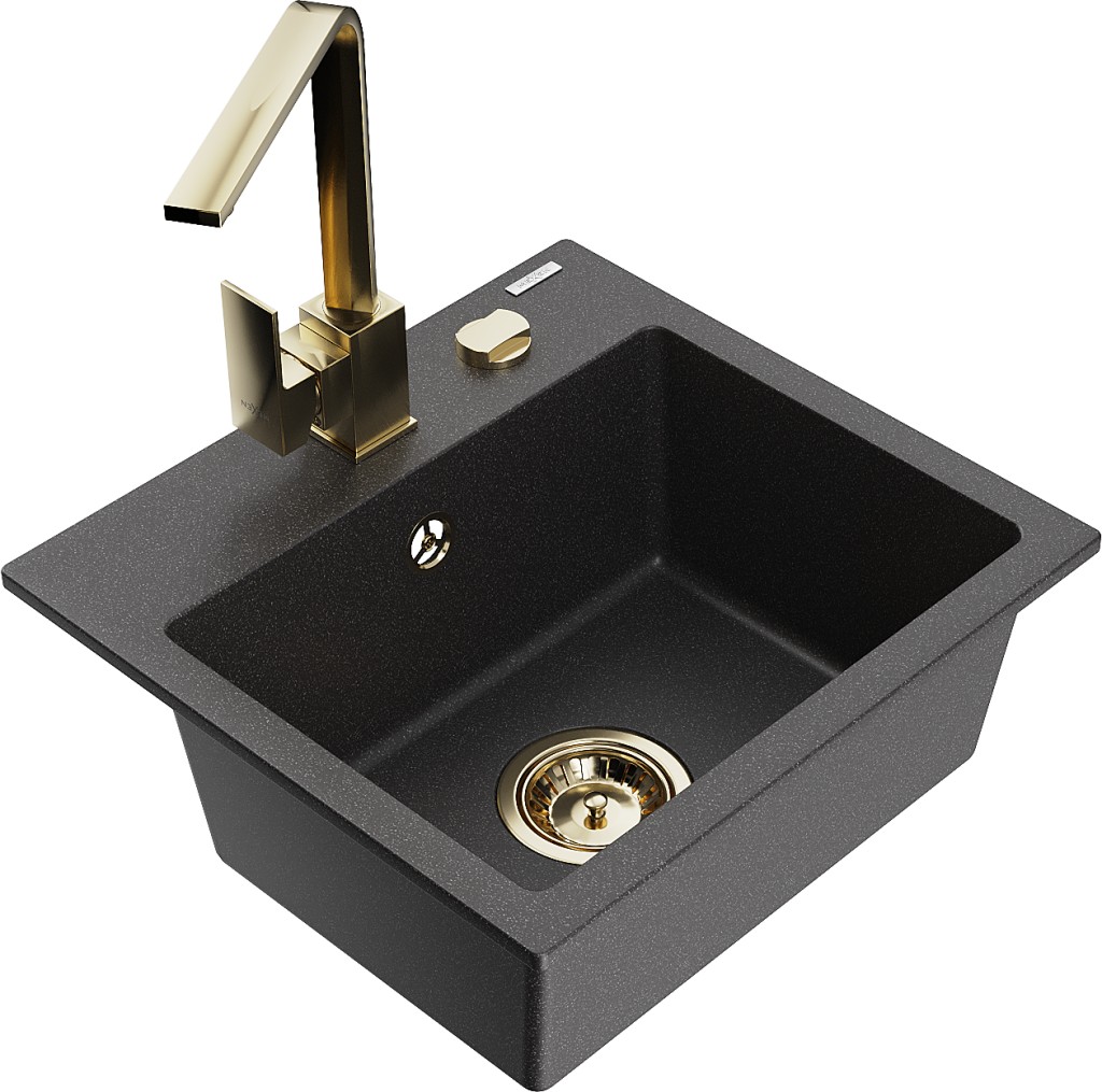 Technické dáta: drez: Rozmer: 435x410x171mm Hĺbka komory: 161 mm Rozmery komory: 375x280 mm Priemer odtoku: ø90 mm Typ: 1-komorový Typ: Zapustené do pracovnej dosky Farba: Škvrnitá čierna Povrchová úprava sifónu: zlatá Materiál: žula (80% žulové kamenivo, 20% živice) Prepadový otvor: Áno Otvory: (batérie, automatické) 2 Vysoká odolnosť proti poškriabaniu a zmene farby Odolnosť proti tepelným šokom Ľahko čistiteľný povrch Jeden dodatočný vyfrézovaný otvor na samodierovanie ø35 kuchynská batéria: Materiál: mosadz Farba: Zlatá Hlava: Keramická Prevzdušňovač: Áno Typ: Jedna páka Výška batérie: 290 mm Rozsah výtoku: 220 mm(GT) Ean: 5905315018403