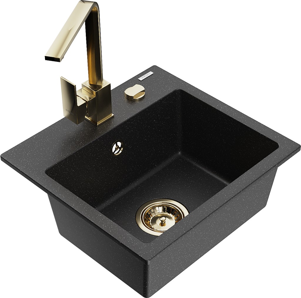 Technické dáta: drez: Rozmer: 435x410x171mm Hĺbka komory: 161 mm Rozmery komory: 375x280 mm Priemer odtoku: ø90 mm Typ: 1-komorový Typ: Zapustené do pracovnej dosky Farba: čierna/strieborná metalíza Povrchová úprava sifónu: zlatá Materiál: žula (80% žulové kamenivo, 20% živice) Prepadový otvor: Áno Otvory: (batérie, automatické) 2 Vysoká odolnosť proti poškriabaniu a zmene farby Odolnosť proti tepelným šokom Ľahko čistiteľný povrch Jeden dodatočný vyfrézovaný otvor na samodierovanie ø35 kuchynská batéria: Materiál: mosadz Farba: Zlatá Hlava: Keramická Prevzdušňovač: Áno Typ: Jedna páka Výška batérie: 290 mm Rozsah výtoku: 220 mm(GT) Ean: 5905315018311