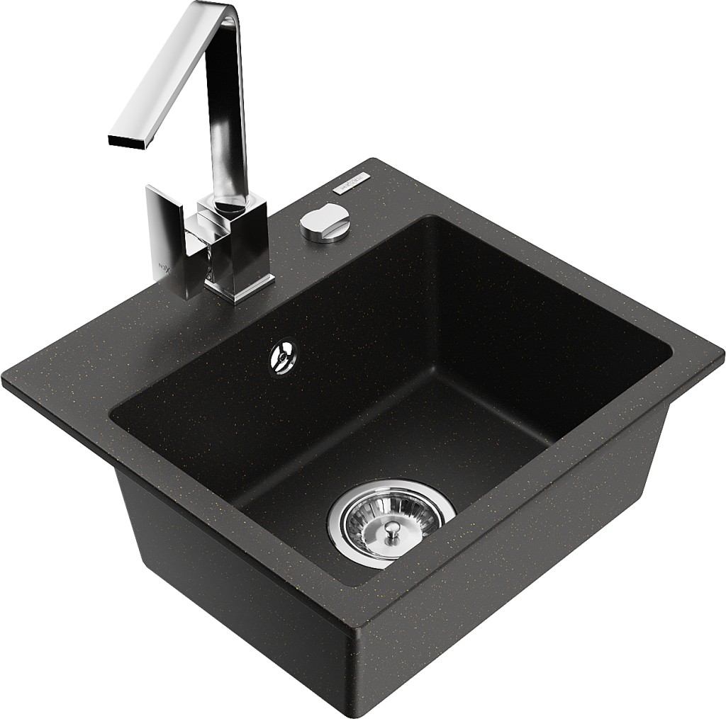 Technické dáta: drez: Rozmer: 435x410x171mm Hĺbka komory: 161 mm Rozmery komory: 375x280 mm Priemer odtoku: ø90 mm Typ: 1-komorový Typ: Zapustené do pracovnej dosky Farba: čierna / zlatá metalíza Povrchová úprava sifónu: Chrome Materiál: žula (80% žulové kamenivo, 20% živice) Prepadový otvor: Áno Otvory: (batérie, automatické) 2 Vysoká odolnosť proti poškriabaniu a zmene farby Odolnosť proti tepelným šokom Ľahko čistiteľný povrch Jeden dodatočný vyfrézovaný otvor na samodierovanie ø35 kuchynská batéria: Materiál: mosadz Farba: Chrome Hlava: Keramická Prevzdušňovač: Áno Typ: Jedna páka Výška batérie: 290 mm Rozsah výtoku: 220 mm(GT) Ean: 5905315018342