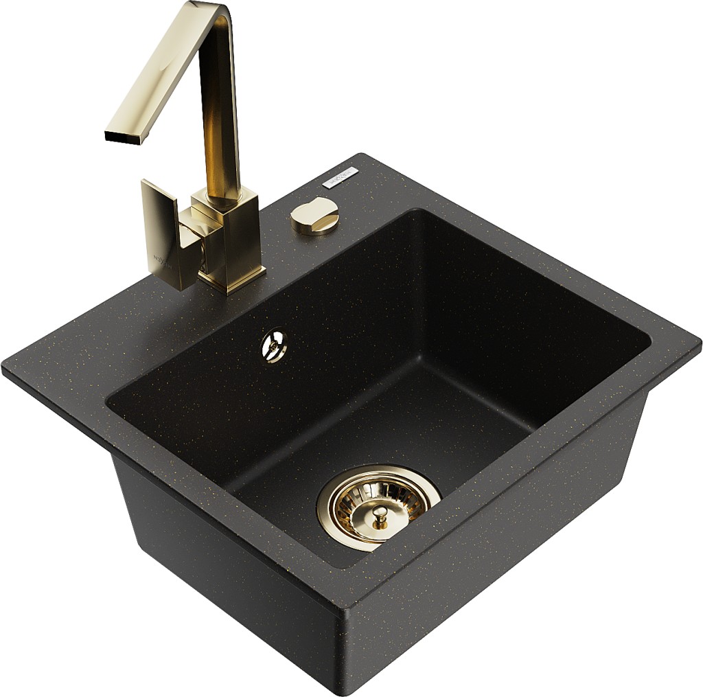 Technické dáta: drez: Rozmer: 435x410x171mm Hĺbka komory: 161 mm Rozmery komory: 375x280 mm Priemer odtoku: ø90 mm Typ: 1-komorový Typ: Zapustené do pracovnej dosky Farba: čierna / zlatá metalíza Povrchová úprava sifónu: zlatá Materiál: žula (80% žulové kamenivo, 20% živice) Prepadový otvor: Áno Otvory: (batérie, automatické) 2 Vysoká odolnosť proti poškriabaniu a zmene farby Odolnosť proti tepelným šokom Ľahko čistiteľný povrch Jeden dodatočný vyfrézovaný otvor na samodierovanie ø35 kuchynská batéria: Materiál: mosadz Farba: Zlatá Hlava: Keramická Prevzdušňovač: Áno Typ: Jedna páka Výška batérie: 290 mm Rozsah výtoku: 220 mm(GT) Ean: 5905315018359