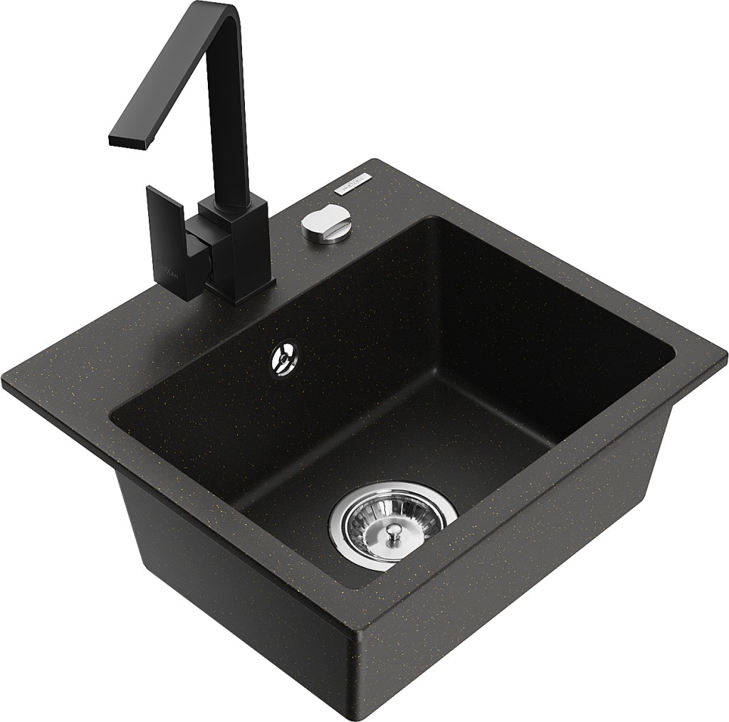 Technické dáta: drez: Rozmer: 435x410x171mm Hĺbka komory: 161 mm Rozmery komory: 375x280 mm Priemer odtoku: ø90 mm Typ: 1-komorový Typ: Zapustené do pracovnej dosky Farba: čierna / zlatá metalíza Povrchová úprava sifónu: Chrome Materiál: žula (80% žulové kamenivo, 20% živice) Prepadový otvor: Áno Otvory: (batérie, automatické) 2 Vysoká odolnosť proti poškriabaniu a zmene farby Odolnosť proti tepelným šokom Ľahko čistiteľný povrch Jeden dodatočný vyfrézovaný otvor na samodierovanie ø35 kuchynská batéria: Materiál: mosadz Čierna farba Hlava: Keramická Prevzdušňovač: Áno Typ: Jedna páka Výška batérie: 290 mm Rozsah výtoku: 220 mm(GT) Ean: 5905315018380