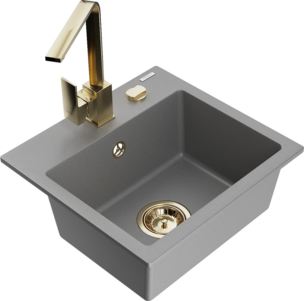 Technické dáta: drez: Rozmer: 435x410x171mm Hĺbka komory: 161 mm Rozmery komory: 375x280 mm Priemer odtoku: ø90 mm Typ: 1-komorový Typ: Zapustené do pracovnej dosky Šedá farba Povrchová úprava sifónu: zlatá Materiál: žula (80% žulové kamenivo, 20% živice) Prepadový otvor: Áno Otvory: (batérie, automatické) 2 Vysoká odolnosť proti poškriabaniu a zmene farby Odolnosť proti tepelným šokom Ľahko čistiteľný povrch Jeden dodatočný vyfrézovaný otvor na samodierovanie ø35 kuchynská batéria: Materiál: mosadz Farba: Zlatá Hlava: Keramická Prevzdušňovač: Áno Typ: Jedna páka Výška batérie: 290 mm Rozsah výtoku: 220 mm(GT) Ean: 5905315018267