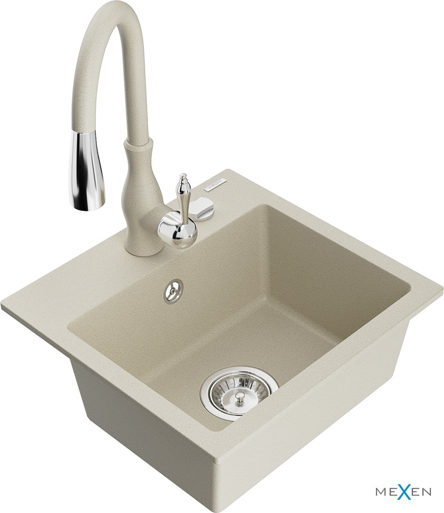 Technické dáta: drez: Rozmer: 435x410x171mm Hĺbka komory: 161 mm Rozmery komory: 375x280 mm Priemer odtoku: ø90 mm Typ: 1-komorový Typ: Zapustené do pracovnej dosky Farba béžová Povrchová úprava sifónu: Chrome Materiál: žula (80% žulové kamenivo, 20% živice) Prepadový otvor: Áno Otvory: (batérie, automatické) 2 Vysoká odolnosť proti poškriabaniu a zmene farby Odolnosť proti tepelným šokom Ľahko čistiteľný povrch Jeden dodatočný vyfrézovaný otvor na samodierovanie ø35 kuchynská batéria: Materiál: mosadz Farba béžová Hlava: Keramická Prevzdušňovač: Áno Typ: Jedna páka Výška batérie: 410 mm Rozsah výtoku: 231 mm (GT) Ean: 5905315033581