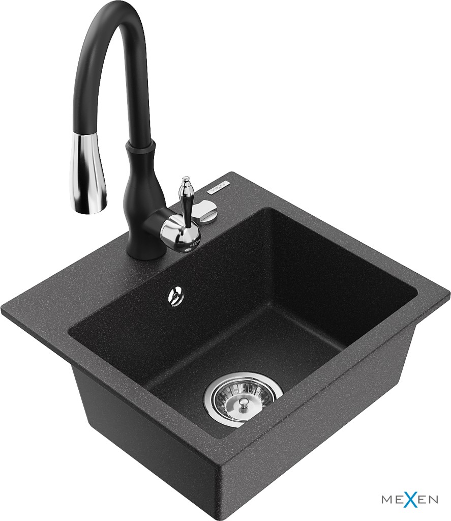 Technické dáta: drez: Rozmer: 435x410x171mm Hĺbka komory: 161 mm Rozmery komory: 375x280 mm Priemer odtoku: ø90 mm Typ: 1-komorový Typ: Zapustené do pracovnej dosky Farba: Škvrnitá čierna Povrchová úprava sifónu: Chrome Materiál: žula (80% žulové kamenivo, 20% živice) Prepadový otvor: Áno Otvory: (batérie, automatické) 2 Vysoká odolnosť proti poškriabaniu a zmene farby Odolnosť proti tepelným šokom Ľahko čistiteľný povrch Jeden dodatočný vyfrézovaný otvor na samodierovanie ø35 kuchynská batéria: Materiál: mosadz Čierna farba Hlava: Keramická Prevzdušňovač: Áno Typ: Jedna páka Výška batérie: 410 mm Rozsah výtoku: 231 mm (GT) Ean: 5905315033772
