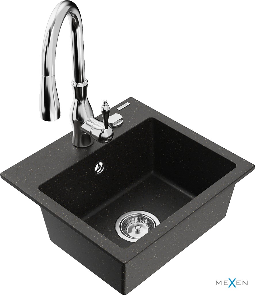 Technické dáta: drez: Rozmer: 435x410x171mm Hĺbka komory: 161 mm Rozmery komory: 375x280 mm Priemer odtoku: ø90 mm Typ: 1-komorový Typ: Zapustené do pracovnej dosky Farba: čierna / zlatá metalíza Povrchová úprava sifónu: Chrome Materiál: žula (80% žulové kamenivo, 20% živice) Prepadový otvor: Áno Otvory: (batérie, automatické) 2 Vysoká odolnosť proti poškriabaniu a zmene farby Odolnosť proti tepelným šokom Ľahko čistiteľný povrch Jeden dodatočný vyfrézovaný otvor na samodierovanie ø35 kuchynská batéria: Materiál: mosadz Farba: Chrome Hlava: Keramická Prevzdušňovač: Áno Typ: Jedna páka Výška batérie: 410 mm Rozsah výtoku: 231 mm(GT) Ean: 5905315033703