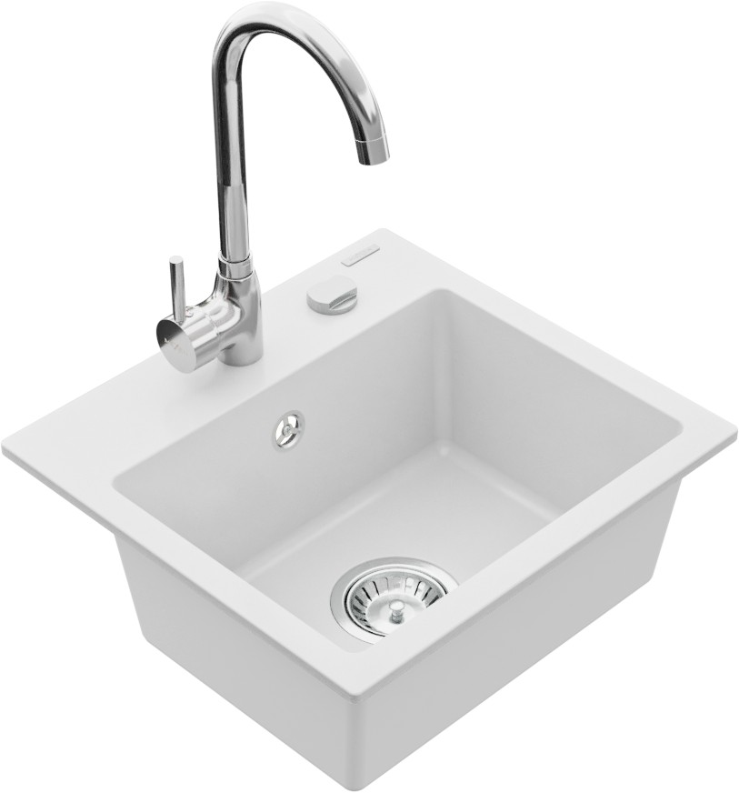 Technické dáta: drez: Rozmer: 435x410x171mm Hĺbka komory: 161 mm Rozmery komory: 375x280 mm Priemer odtoku: ø90 mm Typ: 1-komorový Typ: Zapustené do pracovnej dosky biela farba Povrchová úprava sifónu: Chrome Materiál: žula (80% žulové kamenivo, 20% živice) Prepadový otvor: Áno Otvory: (batérie, automatické) 2 Vysoká odolnosť proti poškriabaniu a zmene farby Odolnosť proti tepelným šokom Ľahko čistiteľný povrch Jeden dodatočný vyfrézovaný otvor na samodierovanie ø35 kuchynská batéria: Materiál: mosadz Farba: Chrome Hlava: Keramická Prevzdušňovač: Áno Výška batérie: 335 mm Rozsah výtoku: 180 mm(GT) Ean: 5907709189553