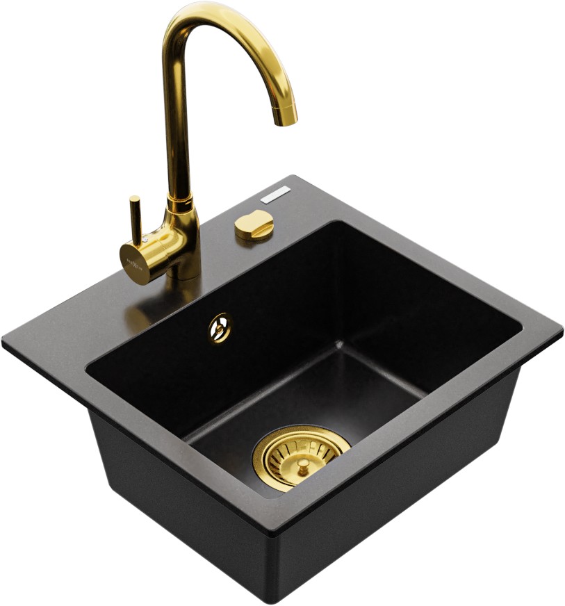 Technické dáta: drez: Rozmer: 435x410x171mm Hĺbka komory: 161 mm Rozmery komory: 375x280 mm Priemer odtoku: ø90 mm Typ: 1-komorový Typ: Zapustené do pracovnej dosky Čierna farba Povrchová úprava sifónu: zlatá Materiál: žula (80% žulové kamenivo, 20% živice) Prepadový otvor: Áno Otvory: (batérie, automatické) 2 Vysoká odolnosť proti poškriabaniu a zmene farby Odolnosť proti tepelným šokom Ľahko čistiteľný povrch Jeden dodatočný vyfrézovaný otvor na samodierovanie ø35 kuchynská batéria: Materiál: mosadz Farba: Zlatá Hlava: Keramická Prevzdušňovač: Áno Výška batérie: 335 mm Rozsah výtoku: 180 mm(GT) Ean: 5907709189676