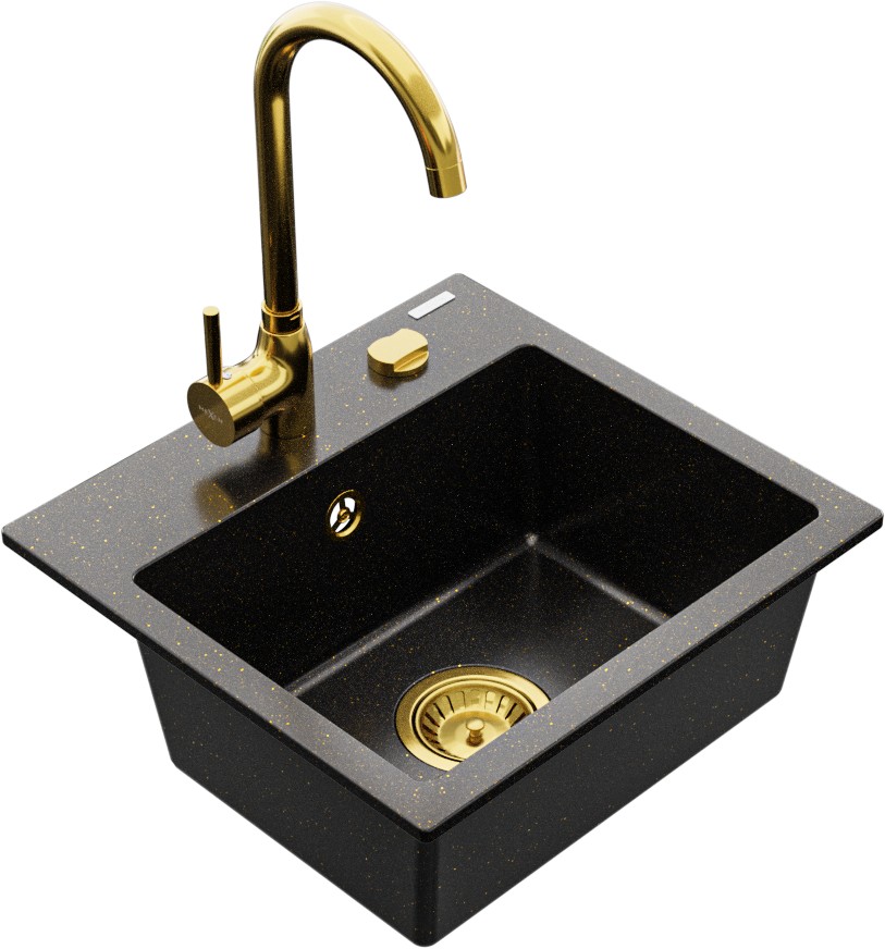 Technické dáta: drez: Rozmer: 435x410x171mm Hĺbka komory: 161 mm Rozmery komory: 375x280 mm Priemer odtoku: ø90 mm Typ: 1-komorový Typ: Zapustené do pracovnej dosky Farba: čierna / zlatá metalíza Povrchová úprava sifónu: zlatá Materiál: žula (80% žulové kamenivo, 20% živice) Prepadový otvor: Áno Otvory: (batérie, automatické) 2 Vysoká odolnosť proti poškriabaniu a zmene farby Odolnosť proti tepelným šokom Ľahko čistiteľný povrch Jeden dodatočný vyfrézovaný otvor na samodierovanie ø35 kuchynská batéria: Materiál: mosadz Farba: Zlatá Hlava: Keramická Prevzdušňovač: Áno Výška batérie: 335 mm Rozsah výtoku: 180 mm(GT) Ean: 5907709189638