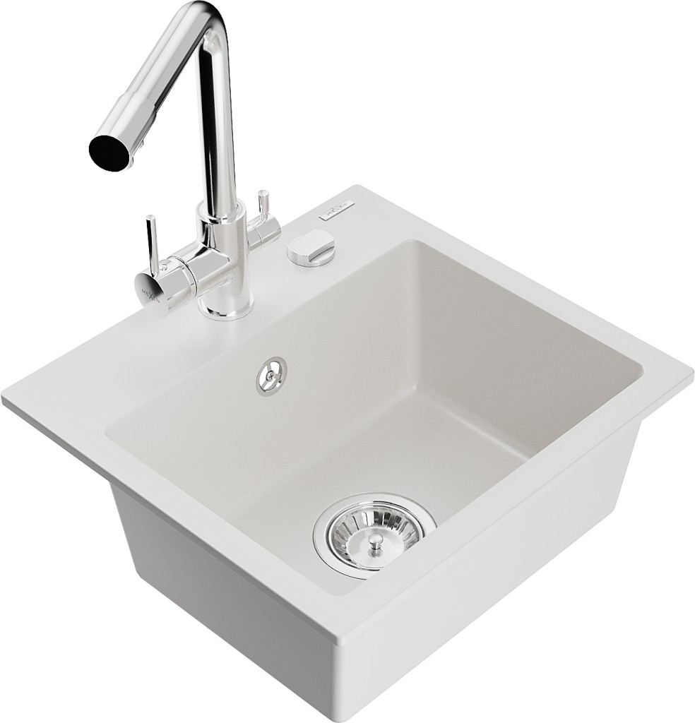 Technické dáta: drez: Rozmer: 435x410x171mm Hĺbka komory: 161 mm Rozmery komory: 375x280 mm Priemer odtoku: ø90 mm Typ: 1-komorový Typ: Zapustené do pracovnej dosky biela farba Povrchová úprava sifónu: Chrome Materiál: žula (80% žulové kamenivo, 20% živice) Prepadový otvor: Áno Otvory: (batérie, automatické) 2 Vysoká odolnosť proti poškriabaniu a zmene farby Odolnosť proti tepelným šokom Ľahko čistiteľný povrch Jeden dodatočný vyfrézovaný otvor na samodierovanie ø35 kuchynská batéria: Materiál: mosadz Farba: Chrome Hlava: Keramická Prevzdušňovač: Áno Typ: Dve rukoväte Rozsah výtoku: 235 mm Výška batérie: 315 mm Dvojhlavá batéria s prídavným kanálom pre filtrovanú pitnú vodu(GT) Ean: 5905315023292