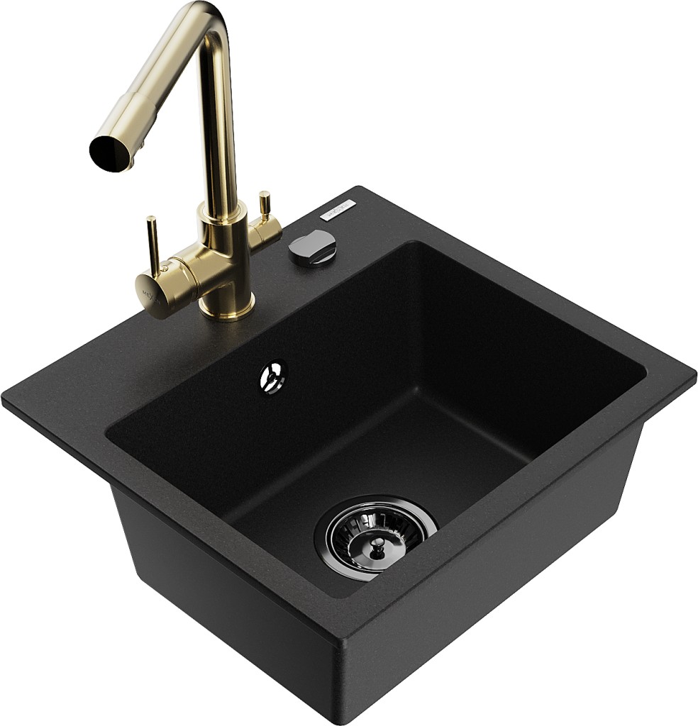 Technické dáta: drez: Rozmer: 435x410x171mm Hĺbka komory: 161 mm Rozmery komory: 375x280 mm Priemer odtoku: ø90 mm Typ: 1-komorový Typ: Zapustené do pracovnej dosky Čierna farba Povrchová úprava sifónu: čierna Materiál: žula (80% žulové kamenivo, 20% živice) Prepadový otvor: Áno Otvory: (batérie, automatické) 2 Vysoká odolnosť proti poškriabaniu a zmene farby Odolnosť proti tepelným šokom Ľahko čistiteľný povrch Jeden dodatočný vyfrézovaný otvor na samodierovanie ø35 kuchynská batéria: Materiál: mosadz Farba: Zlatá Hlava: Keramická Prevzdušňovač: Áno Typ: Dve rukoväte Rozsah výtoku: 235 mm Výška batérie: 315 mm Dvojhlavá batéria s prídavným kanálom pre filtrovanú pitnú vodu(GT) Ean: 5905315023582