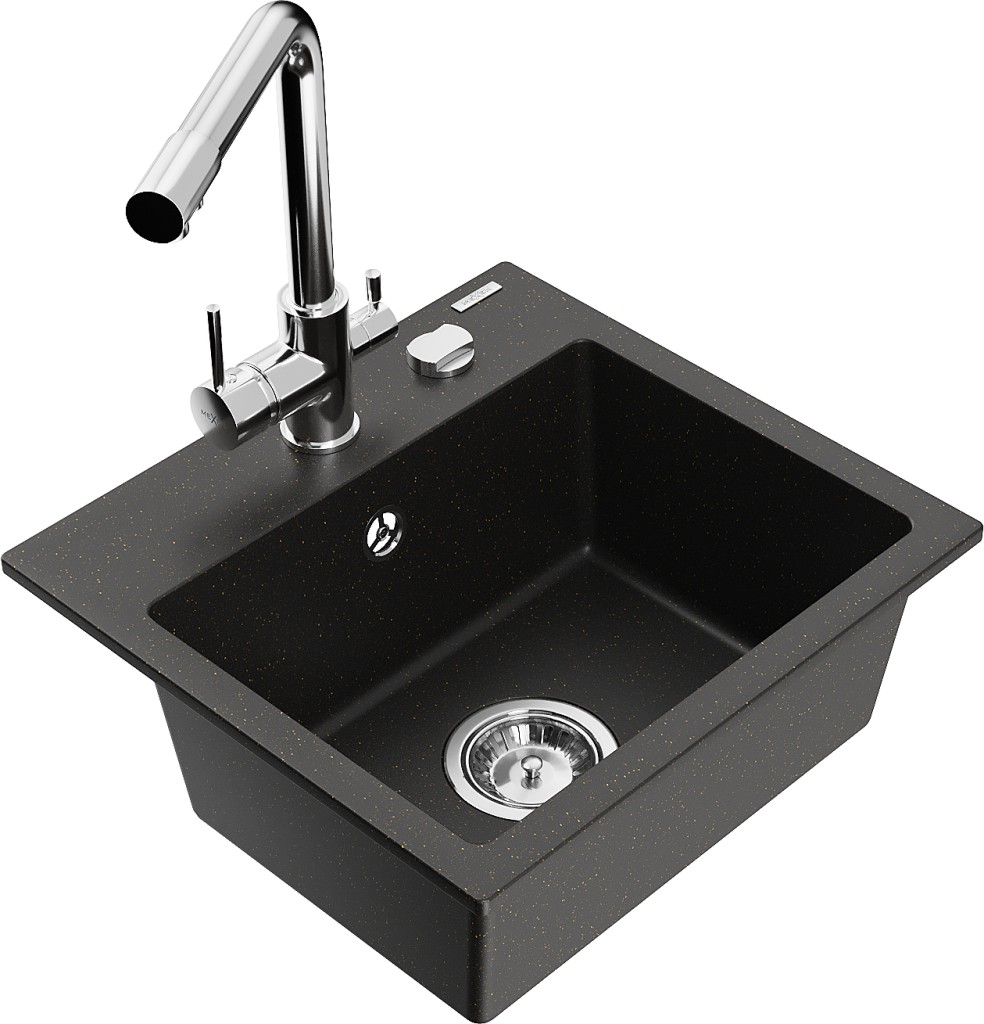 Technické dáta: drez: Rozmer: 435x410x171mm Hĺbka komory: 161 mm Rozmery komory: 375x280 mm Priemer odtoku: ø90 mm Typ: 1-komorový Typ: Zapustené do pracovnej dosky Farba: čierna / zlatá metalíza Povrchová úprava sifónu: Chrome Materiál: žula (80% žulové kamenivo, 20% živice) Prepadový otvor: Áno Otvory: (batérie, automatické) 2 Vysoká odolnosť proti poškriabaniu a zmene farby Odolnosť proti tepelným šokom Ľahko čistiteľný povrch Jeden dodatočný vyfrézovaný otvor na samodierovanie ø35 kuchynská batéria: Materiál: mosadz Farba: Chrome Hlava: Keramická Prevzdušňovač: Áno Typ: Dve rukoväte Rozsah výtoku: 235 mm Výška batérie: 315 mm Dvojhlavá batéria s prídavným kanálom pre filtrovanú pitnú vodu(GT) Ean: 5905315023469