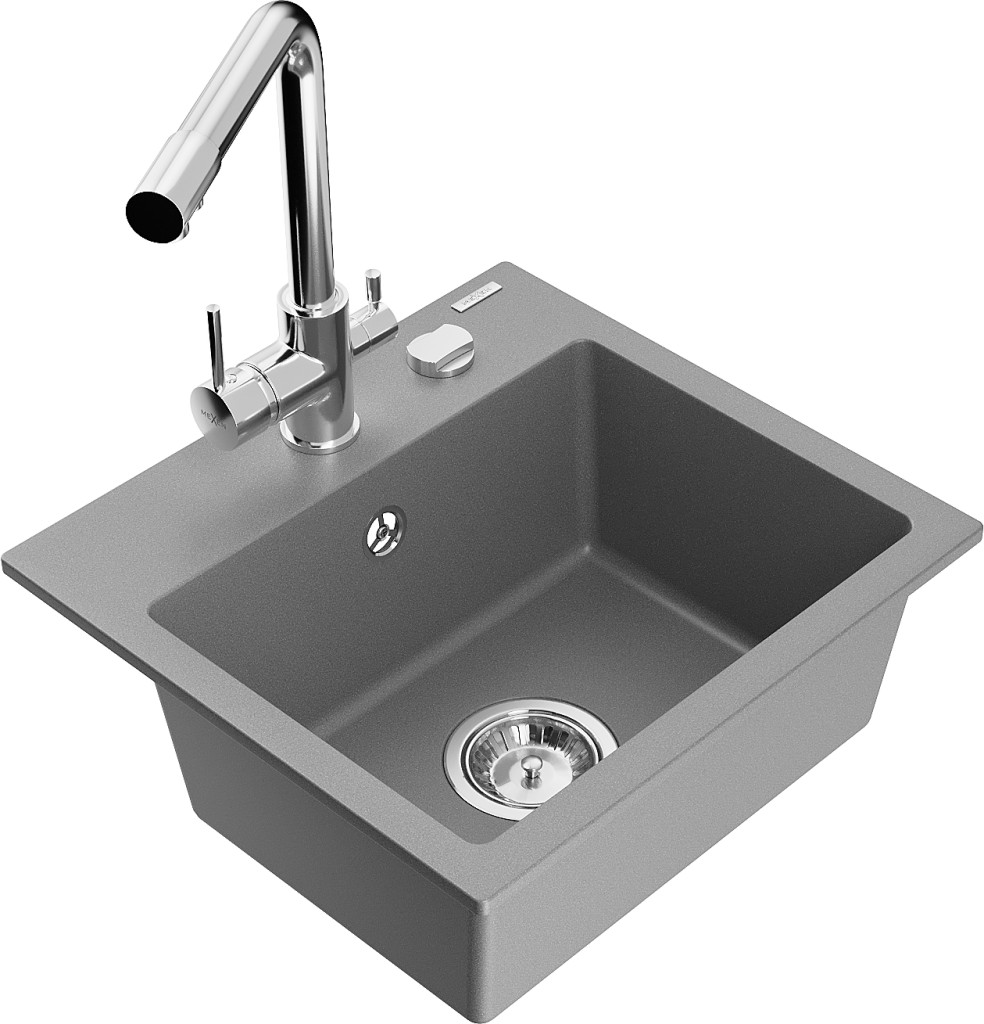 Technické dáta: drez: Rozmer: 435x410x171mm Hĺbka komory: 161 mm Rozmery komory: 375x280 mm Priemer odtoku: ø90 mm Typ: 1-komorový Typ: Zapustené do pracovnej dosky Šedá farba Povrchová úprava sifónu: Chrome Materiál: žula (80% žulové kamenivo, 20% živice) Prepadový otvor: Áno Otvory: (batérie, automatické) 2 Vysoká odolnosť proti poškriabaniu a zmene farby Odolnosť proti tepelným šokom Ľahko čistiteľný povrch Jeden dodatočný vyfrézovaný otvor na samodierovanie ø35 kuchynská batéria: Materiál: mosadz Farba: Chrome Hlava: Keramická Prevzdušňovač: Áno Typ: Dve rukoväte Rozsah výtoku: 235 mm Výška batérie: 315 mm Dvojhlavá batéria s prídavným kanálom pre filtrovanú pitnú vodu(GT) Ean: 5905315023377
