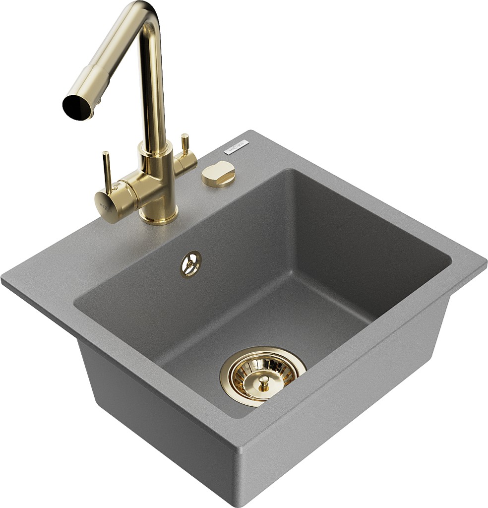 Technické dáta: drez: Rozmer: 435x410x171mm Hĺbka komory: 161 mm Rozmery komory: 375x280 mm Priemer odtoku: ø90 mm Typ: 1-komorový Typ: Zapustené do pracovnej dosky Šedá farba Povrchová úprava sifónu: zlatá Materiál: žula (80% žulové kamenivo, 20% živice) Prepadový otvor: Áno Otvory: (batérie, automatické) 2 Vysoká odolnosť proti poškriabaniu a zmene farby Odolnosť proti tepelným šokom Ľahko čistiteľný povrch Jeden dodatočný vyfrézovaný otvor na samodierovanie ø35 kuchynská batéria: Materiál: mosadz Farba: Zlatá Hlava: Keramická Prevzdušňovač: Áno Typ: Dve rukoväte Rozsah výtoku: 235 mm Výška batérie: 315 mm Dvojhlavá batéria s prídavným kanálom pre filtrovanú pitnú vodu(GT) Ean: 5905315023384