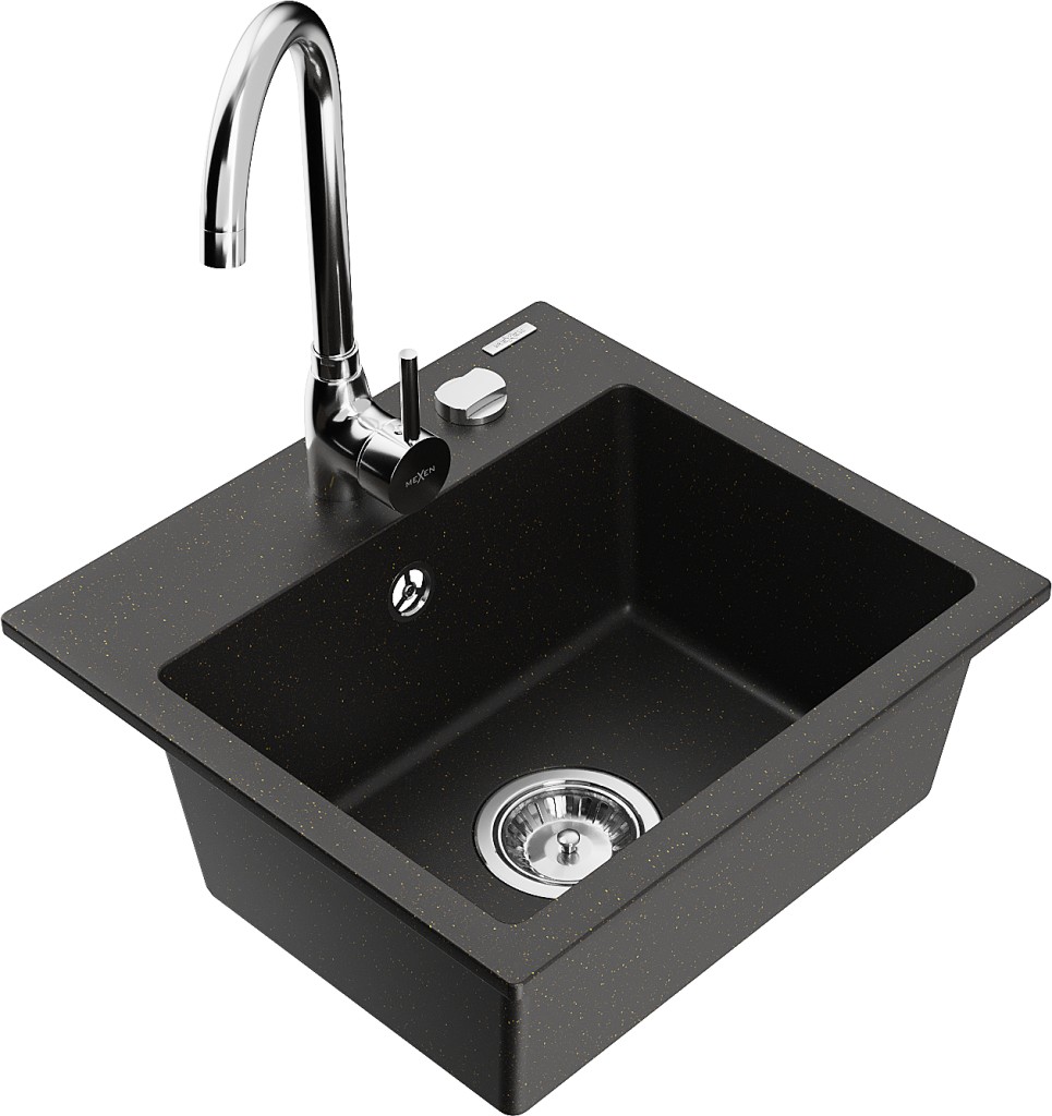 Technické dáta: drez: Rozmer: 435x410x171mm Hĺbka komory: 161 mm Rozmery komory: 375x280 mm Priemer odtoku: ø90 mm Typ: 1-komorový Typ: Zapustené do pracovnej dosky Farba: čierna / zlatá metalíza Povrchová úprava sifónu: Chrome Materiál: žula (80% žulové kamenivo, 20% živice) Prepadový otvor: Áno Otvory: (batérie, automatické) 2 Vysoká odolnosť proti poškriabaniu a zmene farby Odolnosť proti tepelným šokom Ľahko čistiteľný povrch Jeden dodatočný vyfrézovaný otvor na samodierovanie ø35 kuchynská batéria: Materiál: mosadz Farba: Chrome Hlava: Keramická Prevzdušňovač: Áno Typ: Jedna páka Výška batérie: 335 mm Rozsah výtoku: 180 mm(GT) Ean: 5905315014498