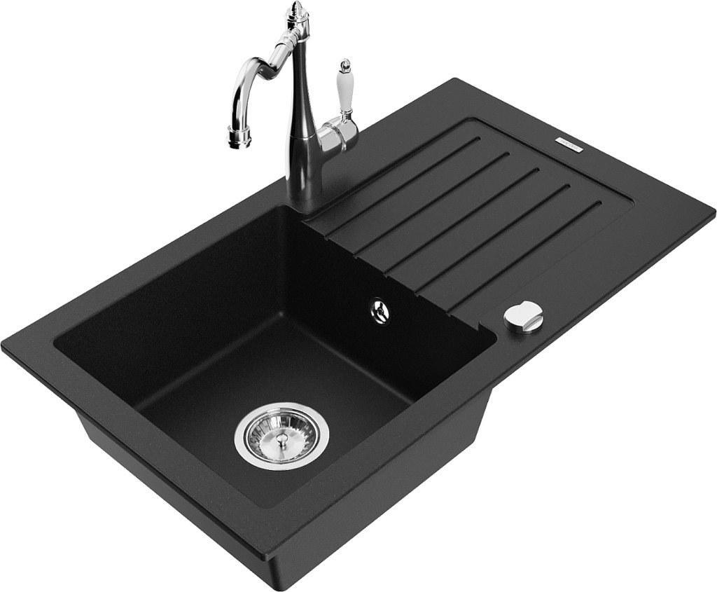 Technické dáta: drez: Rozmer: 752 x 436 x 161 mm Hĺbka komory: 151 mm Rozmery komory: 356x332 mm Priemer odtoku: ø90 mm Typ: 1-miska s odkvapkávačom Typ: Zapustené do pracovnej dosky Čierna farba Povrchová úprava sifónu: Chrome Materiál: žula (80% žulové kamenivo, 20% živice) Prepadový otvor: Áno Otvory: (batérie, automatické) 2 Inštalácia: Univerzálna, je možné inštalovať s odkvapkávačom na ľavú alebo pravú stranu Vysoká odolnosť proti poškriabaniu a zmene farby Odolnosť proti tepelným šokom Ľahko čistiteľný povrch Dva dodatočné vyfrézované otvory na samodierovanie ø35 kuchynská batéria: Materiál: mosadz Farba: Chrome Hlava: Keramická Prevzdušňovač: Áno Typ: Jedna páka Výška batérie: 290 mm Rozsah výtoku: 260 mm(GT) Ean: 5905315039897