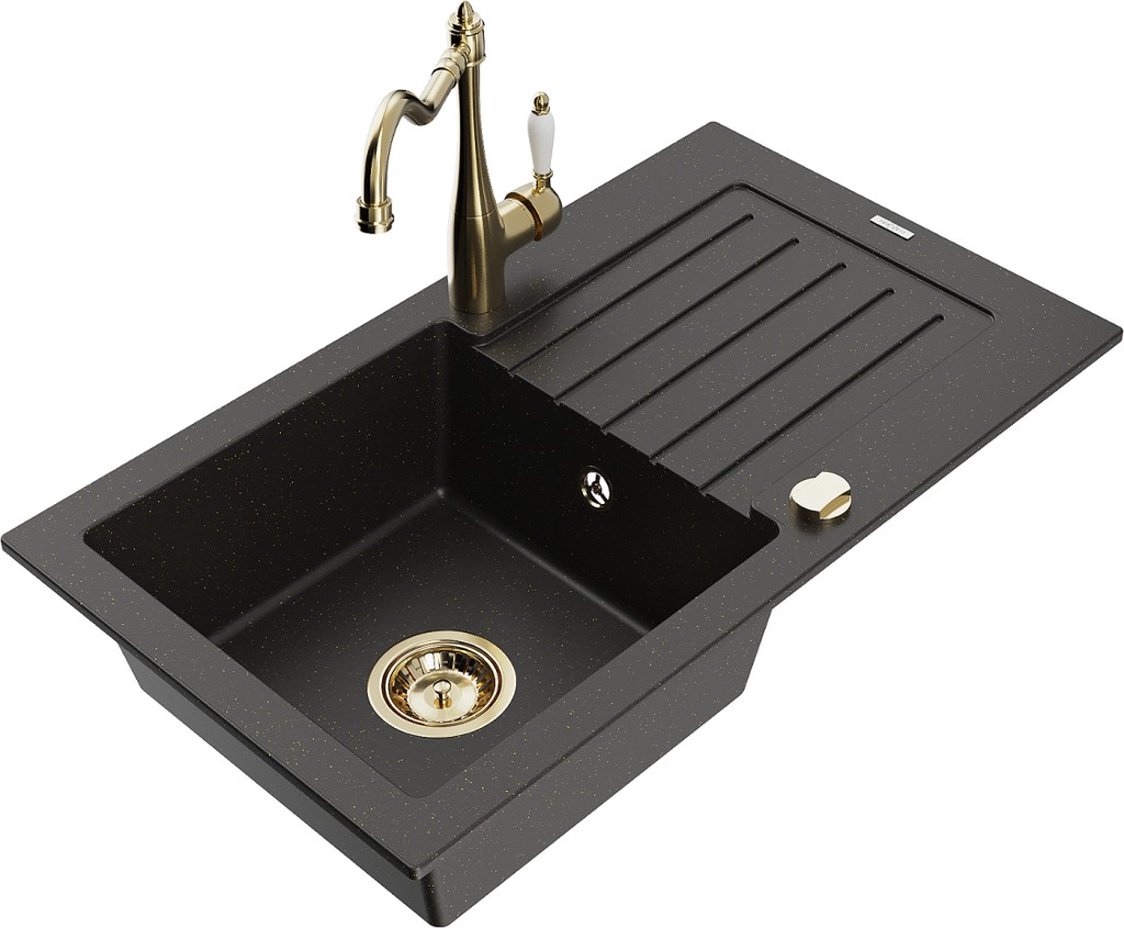Technické dáta: drez: Rozmer: 752 x 436 x 161 mm Hĺbka komory: 151 mm Rozmery komory: 356x332 mm Priemer odtoku: ø90 mm Typ: 1-miska s odkvapkávačom Typ: Zapustené do pracovnej dosky Farba: čierna / zlatá metalíza Povrchová úprava sifónu: zlatá Materiál: žula (80% žulové kamenivo, 20% živice) Prepadový otvor: Áno Otvory: (batérie, automatické) 2 Inštalácia: Univerzálna, je možné inštalovať s odkvapkávačom na ľavú alebo pravú stranu Vysoká odolnosť proti poškriabaniu a zmene farby Odolnosť proti tepelným šokom Ľahko čistiteľný povrch Dva dodatočné vyfrézované otvory na samodierovanie ø35 kuchynská batéria: Materiál: mosadz Farba: Zlatá Hlava: Keramická Prevzdušňovač: Áno Typ: Jedna páka Výška batérie: 290 mm Rozsah výtoku: 260 mm(GT) Ean: 5905315039804