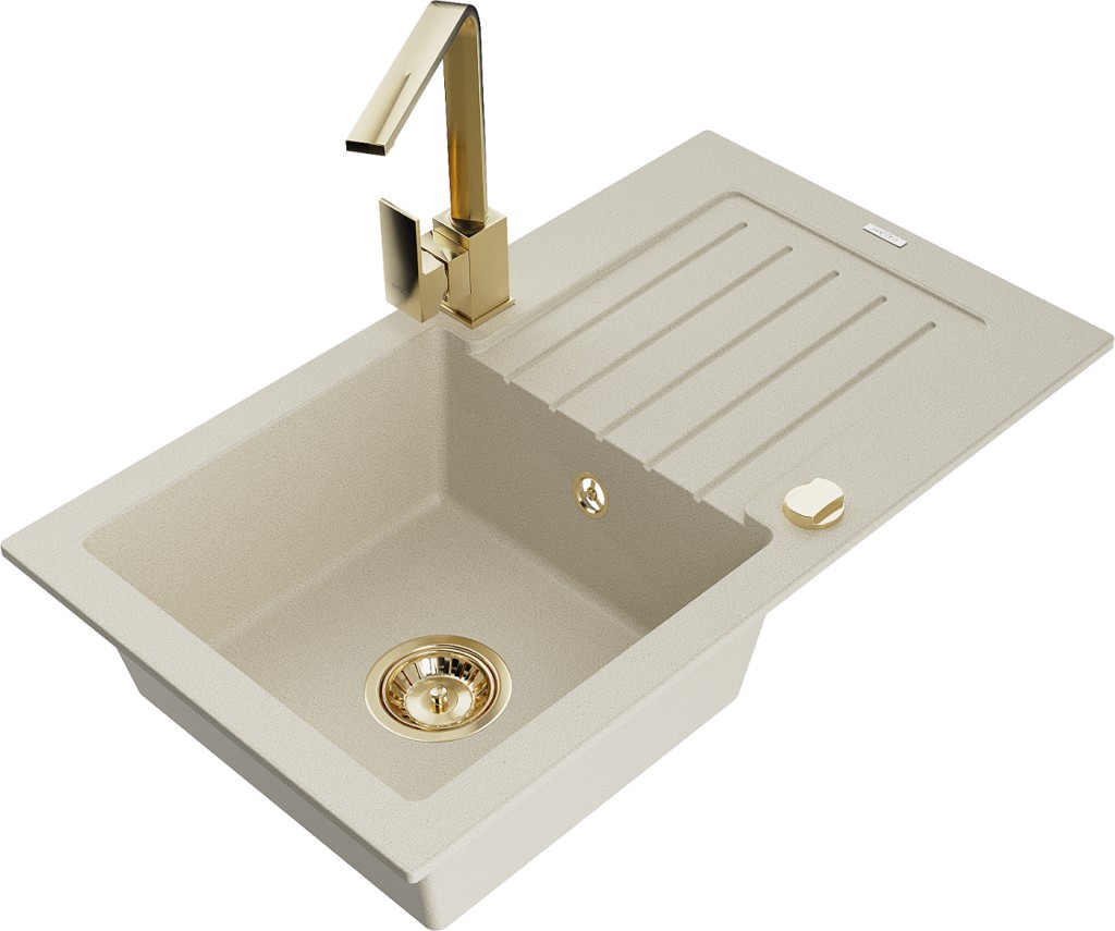 Technické dáta: drez: Rozmer: 752 x 436 x 161 mm Hĺbka komory: 151 mm Rozmery komory: 356x332 mm Priemer odtoku: ø90 mm Typ: 1-miska s odkvapkávačom Typ: Zapustené do pracovnej dosky Farba béžová Povrchová úprava sifónu: zlatá Materiál: žula (80% žulové kamenivo, 20% živice) Prepadový otvor: Áno Otvory: (batérie, automatické) 2 Inštalácia: Univerzálna, je možné inštalovať s odkvapkávačom na ľavú alebo pravú stranu Vysoká odolnosť proti poškriabaniu a zmene farby Odolnosť proti tepelným šokom Ľahko čistiteľný povrch Dva dodatočné vyfrézované otvory na samodierovanie ø35 kuchynská batéria: Materiál: mosadz Farba: Zlatá Hlava: Keramická Prevzdušňovač: Áno Typ: Jedna páka Výška batérie: 290 mm Rozsah výtoku: 220 mm(GT) Ean: 5905315019196