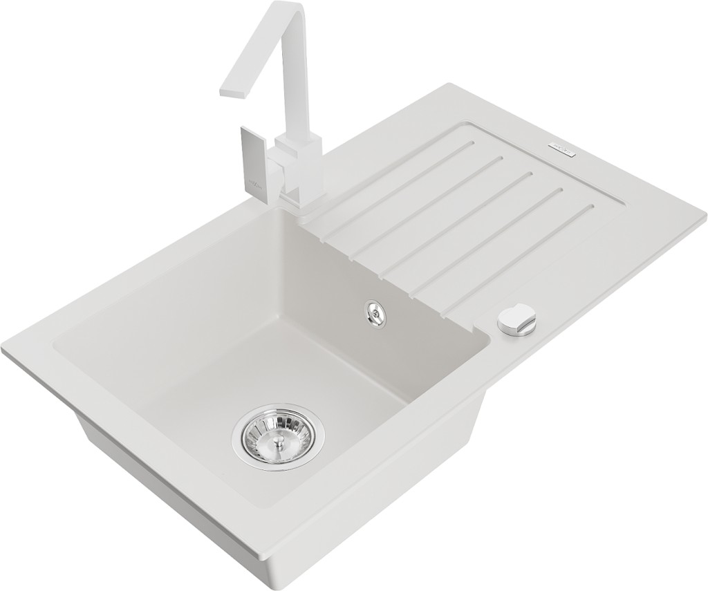 Technické dáta: drez: Rozmer: 752 x 436 x 161 mm Hĺbka komory: 151 mm Rozmery komory: 356x332 mm Priemer odtoku: ø90 mm Typ: 1-miska s odkvapkávačom Typ: Zapustené do pracovnej dosky biela farba Povrchová úprava sifónu: Chrome Materiál: žula (80% žulové kamenivo, 20% živice) Prepadový otvor: Áno Otvory: (batérie, automatické) 2 Inštalácia: Univerzálna, je možné inštalovať s odkvapkávačom na ľavú alebo pravú stranu Vysoká odolnosť proti poškriabaniu a zmene farby Odolnosť proti tepelným šokom Ľahko čistiteľný povrch Dva dodatočné vyfrézované otvory na samodierovanie ø35 kuchynská batéria: Materiál: mosadz biela farba Hlava: Keramická Prevzdušňovač: Áno Typ: Jedna páka Výška batérie: 290 mm Rozsah výtoku: 220 mm(GT) Ean: 5905315019141
