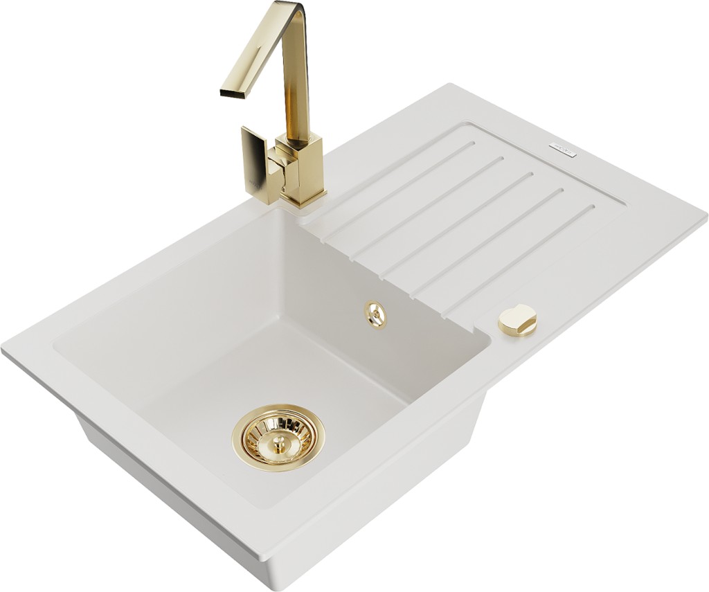 Technické dáta: drez: Rozmer: 752 x 436 x 161 mm Hĺbka komory: 151 mm Rozmery komory: 356x332 mm Priemer odtoku: ø90 mm Typ: 1-miska s odkvapkávačom Typ: Zapustené do pracovnej dosky biela farba Povrchová úprava sifónu: zlatá Materiál: žula (80% žulové kamenivo, 20% živice) Prepadový otvor: Áno Otvory: (batérie, automatické) 2 Inštalácia: Univerzálna, je možné inštalovať s odkvapkávačom na ľavú alebo pravú stranu Vysoká odolnosť proti poškriabaniu a zmene farby Odolnosť proti tepelným šokom Ľahko čistiteľný povrch Dva dodatočné vyfrézované otvory na samodierovanie ø35 kuchynská batéria: Materiál: mosadz Farba: Zlatá Hlava: Keramická Prevzdušňovač: Áno Typ: Jedna páka Výška batérie: 290 mm Rozsah výtoku: 220 mm(GT) Ean: 5905315019158