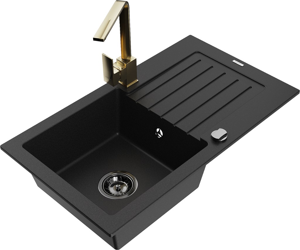 Technické dáta: drez: Rozmer: 752 x 436 x 161 mm Hĺbka komory: 151 mm Rozmery komory: 356x332 mm Priemer odtoku: ø90 mm Typ: 1-miska s odkvapkávačom Typ: Zapustené do pracovnej dosky Čierna farba Povrchová úprava sifónu: čierna Materiál: žula (80% žulové kamenivo, 20% živice) Prepadový otvor: Áno Otvory: (batérie, automatické) 2 Inštalácia: Univerzálna, je možné inštalovať s odkvapkávačom na ľavú alebo pravú stranu Vysoká odolnosť proti poškriabaniu a zmene farby Odolnosť proti tepelným šokom Ľahko čistiteľný povrch Dva dodatočné vyfrézované otvory na samodierovanie ø35 kuchynská batéria: Materiál: mosadz Farba: Zlatá Hlava: Keramická Prevzdušňovač: Áno Typ: Jedna páka Výška batérie: 290 mm Rozsah výtoku: 220 mm(GT) Ean: 5905315019424