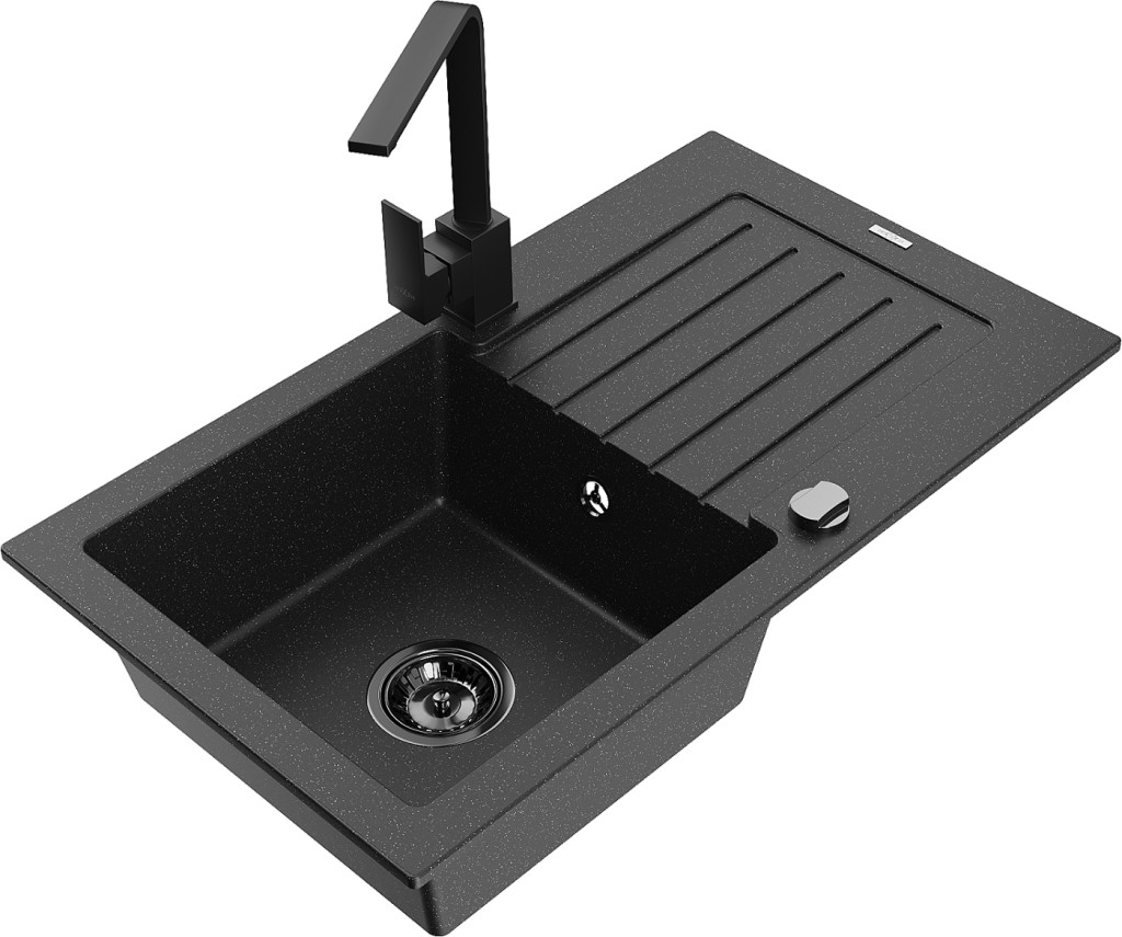 Technické dáta: drez: Rozmer: 752 x 436 x 161 mm Hĺbka komory: 151 mm Rozmery komory: 356x332 mm Priemer odtoku: ø90 mm Typ: 1-miska s odkvapkávačom Typ: Zapustené do pracovnej dosky Farba: čierna/strieborná metalíza Povrchová úprava sifónu: čierna Materiál: žula (80% žulové kamenivo, 20% živice) Prepadový otvor: Áno Otvory: (batérie, automatické) 2 Inštalácia: Univerzálna, je možné inštalovať s odkvapkávačom na ľavú alebo pravú stranu Vysoká odolnosť proti poškriabaniu a zmene farby Odolnosť proti tepelným šokom Ľahko čistiteľný povrch Dva dodatočné vyfrézované otvory na samodierovanie ø35 kuchynská batéria: Materiál: mosadz Čierna farba Hlava: Keramická Prevzdušňovač: Áno Typ: Jedna páka Výška batérie: 290 mm Rozsah výtoku: 220 mm(GT) Ean: 5905315019295