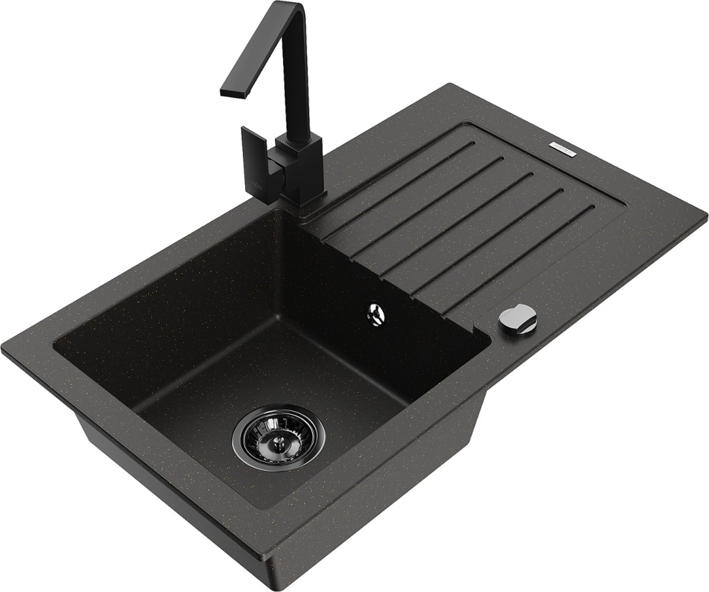 Technické dáta: drez: Rozmer: 752 x 436 x 161 mm Hĺbka komory: 151 mm Rozmery komory: 356x332 mm Priemer odtoku: ø90 mm Typ: 1-miska s odkvapkávačom Typ: Zapustené do pracovnej dosky Farba: čierna / zlatá metalíza Povrchová úprava sifónu: čierna Materiál: žula (80% žulové kamenivo, 20% živice) Prepadový otvor: Áno Otvory: (batérie, automatické) 2 Inštalácia: Univerzálna, je možné inštalovať s odkvapkávačom na ľavú alebo pravú stranu Vysoká odolnosť proti poškriabaniu a zmene farby Odolnosť proti tepelným šokom Ľahko čistiteľný povrch Dva dodatočné vyfrézované otvory na samodierovanie ø35 kuchynská batéria: Materiál: mosadz Čierna farba Hlava: Keramická Prevzdušňovač: Áno Typ: Jedna páka Výška batérie: 290 mm Rozsah výtoku: 220 mm(GT) Ean: 5905315019332