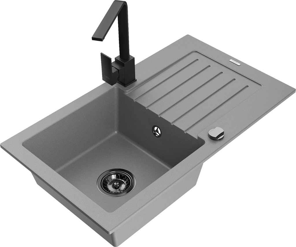 Technické dáta: drez: Rozmer: 752 x 436 x 161 mm Hĺbka komory: 151 mm Rozmery komory: 356x332 mm Priemer odtoku: ø90 mm Typ: 1-miska s odkvapkávačom Typ: Zapustené do pracovnej dosky Šedá farba Povrchová úprava sifónu: čierna Materiál: žula (80% žulové kamenivo, 20% živice) Prepadový otvor: Áno Otvory: (batérie, automatické) 2 Inštalácia: Univerzálna, je možné inštalovať s odkvapkávačom na ľavú alebo pravú stranu Vysoká odolnosť proti poškriabaniu a zmene farby Odolnosť proti tepelným šokom Ľahko čistiteľný povrch Dva dodatočné vyfrézované otvory na samodierovanie ø35 kuchynská batéria: Materiál: mosadz Čierna farba Hlava: Keramická Prevzdušňovač: Áno Typ: Jedna páka Výška batérie: 290 mm Rozsah výtoku: 220 mm(GT) Ean: 5905315019240