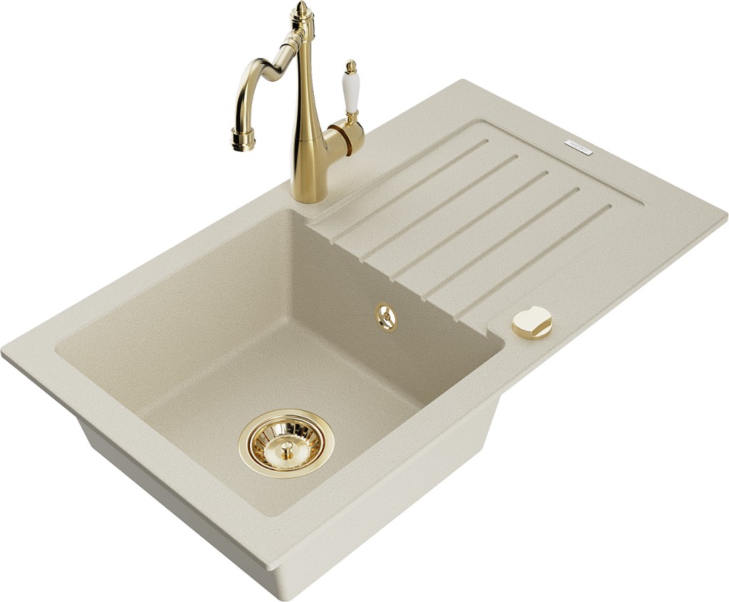 Technické dáta: drez: Rozmer: 752 x 436 x 161 mm Hĺbka komory: 151 mm Rozmery komory: 356x332 mm Priemer odtoku: ø90 mm Typ: 1-miska s odkvapkávačom Typ: Zapustené do pracovnej dosky Farba béžová Povrchová úprava sifónu: zlatá Materiál: žula (80% žulové kamenivo, 20% živice) Prepadový otvor: Áno Otvory: (batérie, automatické) 2 Inštalácia: Univerzálna, je možné inštalovať s odkvapkávačom na ľavú alebo pravú stranu Vysoká odolnosť proti poškriabaniu a zmene farby Odolnosť proti tepelným šokom Ľahko čistiteľný povrch Dva dodatočné vyfrézované otvory na samodierovanie ø35 kuchynská batéria: Materiál: mosadz Farba: Zlatá Hlava: Keramická Prevzdušňovač: Áno Typ: Jedna páka Výška batérie: 290 mm Rozsah výtoku: 260 mm(GT) Ean: 5905315039682