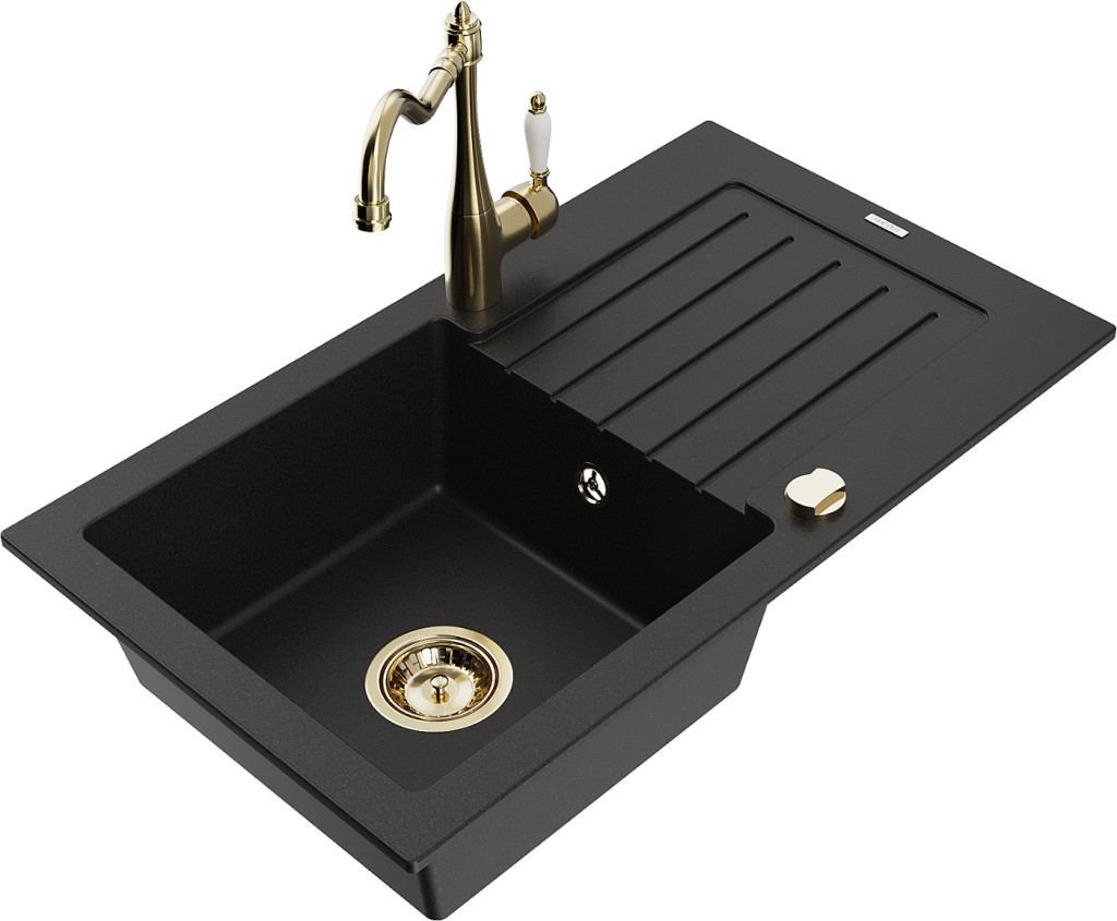 Technické dáta: drez: Rozmer: 752 x 436 x 161 mm Hĺbka komory: 151 mm Rozmery komory: 356x332 mm Priemer odtoku: ø90 mm Typ: 1-miska s odkvapkávačom Typ: Zapustené do pracovnej dosky Čierna farba Povrchová úprava sifónu: zlatá Materiál: žula (80% žulové kamenivo, 20% živice) Prepadový otvor: Áno Otvory: (batérie, automatické) 2 Inštalácia: Univerzálna, je možné inštalovať s odkvapkávačom na ľavú alebo pravú stranu Vysoká odolnosť proti poškriabaniu a zmene farby Odolnosť proti tepelným šokom Ľahko čistiteľný povrch Dva dodatočné vyfrézované otvory na samodierovanie ø35 kuchynská batéria: Materiál: mosadz Farba: Zlatá Hlava: Keramická Prevzdušňovač: Áno Typ: Jedna páka Výška batérie: 290 mm Rozsah výtoku: 260 mm(GT) Ean: 5905315039903