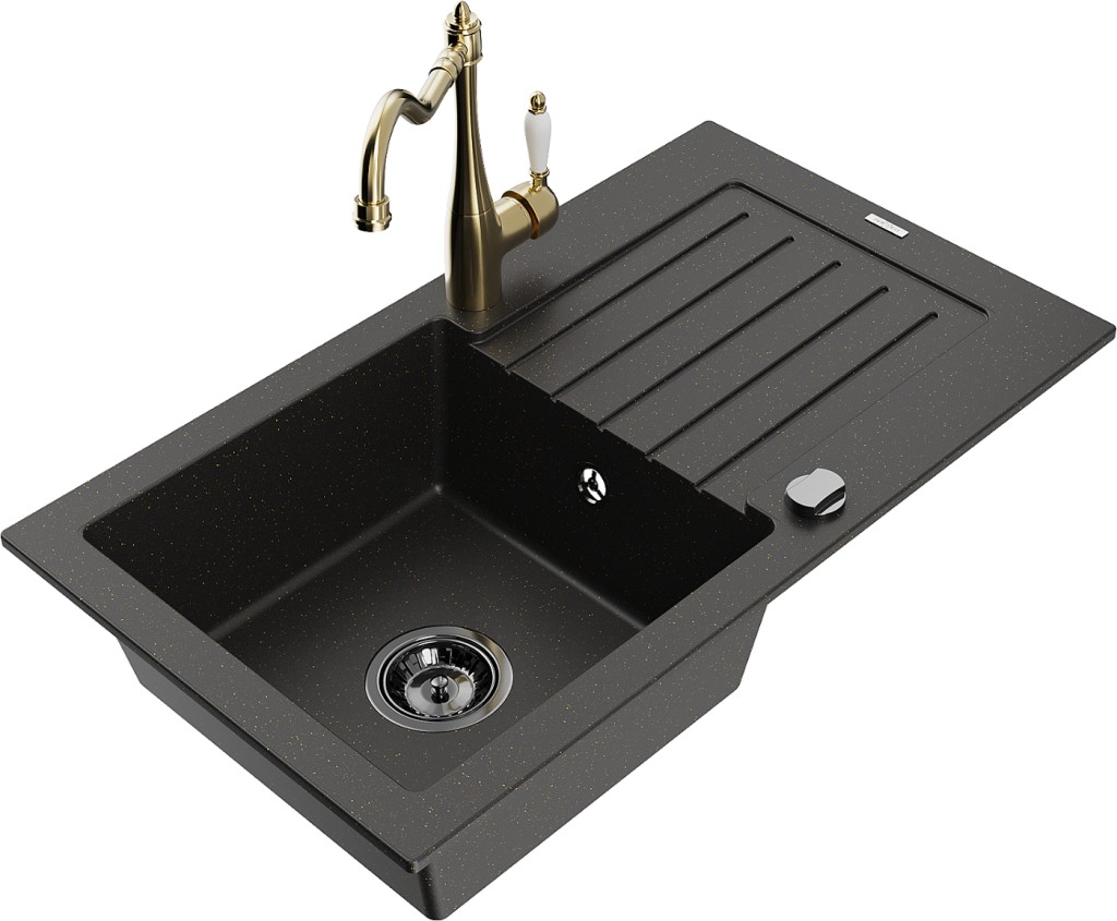 Technické dáta: drez: Rozmer: 752 x 436 x 161 mm Hĺbka komory: 151 mm Rozmery komory: 356x332 mm Priemer odtoku: ø90 mm Typ: 1-miska s odkvapkávačom Typ: Zapustené do pracovnej dosky Farba: čierna / zlatá metalíza Povrchová úprava sifónu: čierna Materiál: žula (80% žulové kamenivo, 20% živice) Prepadový otvor: Áno Otvory: (batérie, automatické) 2 Inštalácia: Univerzálna, je možné inštalovať s odkvapkávačom na ľavú alebo pravú stranu Vysoká odolnosť proti poškriabaniu a zmene farby Odolnosť proti tepelným šokom Ľahko čistiteľný povrch Dva dodatočné vyfrézované otvory na samodierovanie ø35 kuchynská batéria: Materiál: mosadz Farba: Zlatá Hlava: Keramická Prevzdušňovač: Áno Typ: Jedna páka Výška batérie: 290 mm Rozsah výtoku: 260 mm(GT) Ean: 5905315039811