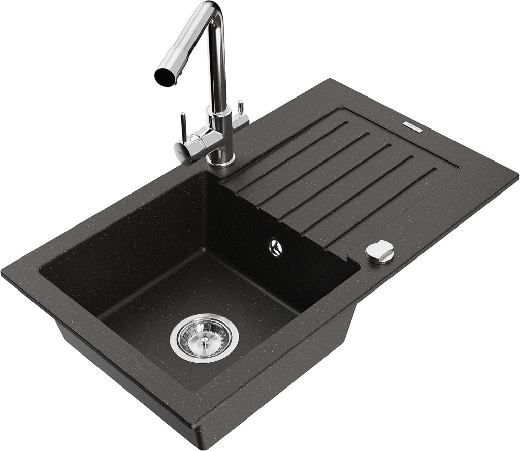 Technické dáta: drez: Rozmer: 752 x 436 x 161 mm Hĺbka komory: 151 mm Rozmery komory: 356x332 mm Priemer odtoku: ø90 mm Typ: 1-miska s odkvapkávačom Typ: Zapustené do pracovnej dosky Farba: čierna / zlatá metalíza Povrchová úprava sifónu: Chrome Materiál: žula (80% žulové kamenivo, 20% živice) Prepadový otvor: Áno Otvory: (batérie, automatické) 2 Inštalácia: Univerzálna, je možné inštalovať s odkvapkávačom na ľavú alebo pravú stranu Vysoká odolnosť proti poškriabaniu a zmene farby Odolnosť proti tepelným šokom Ľahko čistiteľný povrch Dva dodatočné vyfrézované otvory na samodierovanie ø35 kuchynská batéria: Materiál: mosadz Farba: Chrome Hlava: Keramická Prevzdušňovač: Áno Typ: Dve rukoväte Rozsah výtoku: 235 mm Výška batérie: 315 mm Dvojhlavá batéria s prídavným kanálom pre filtrovanú pitnú vodu(GT) Ean: 5905315024428