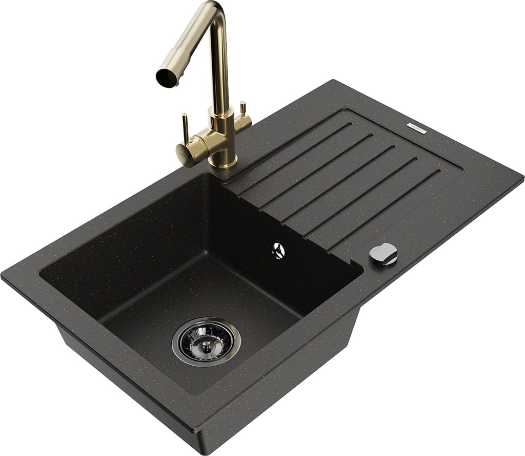 Technické dáta: drez: Rozmer: 752 x 436 x 161 mm Hĺbka komory: 151 mm Rozmery komory: 356x332 mm Priemer odtoku: ø90 mm Typ: 1-miska s odkvapkávačom Typ: Zapustené do pracovnej dosky Farba: čierna / zlatá metalíza Povrchová úprava sifónu: čierna Materiál: žula (80% žulové kamenivo, 20% živice) Prepadový otvor: Áno Otvory: (batérie, automatické) 2 Inštalácia: Univerzálna, je možné inštalovať s odkvapkávačom na ľavú alebo pravú stranu Vysoká odolnosť proti poškriabaniu a zmene farby Odolnosť proti tepelným šokom Ľahko čistiteľný povrch Dva dodatočné vyfrézované otvory na samodierovanie ø35 kuchynská batéria: Materiál: mosadz Farba: Zlatá Hlava: Keramická Prevzdušňovač: Áno Typ: Dve rukoväte Rozsah výtoku: 235 mm Výška batérie: 315 mm Dvojhlavá batéria s prídavným kanálom pre filtrovanú pitnú vodu(GT) Ean: 5905315024442