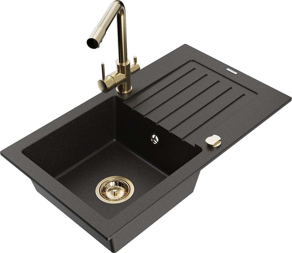 Technické dáta: drez: Rozmer: 752 x 436 x 161 mm Hĺbka komory: 151 mm Rozmery komory: 356x332 mm Priemer odtoku: ø90 mm Typ: 1-miska s odkvapkávačom Typ: Zapustené do pracovnej dosky Farba: čierna / zlatá metalíza Povrchová úprava sifónu: zlatá Materiál: žula (80% žulové kamenivo, 20% živice) Prepadový otvor: Áno Otvory: (batérie, automatické) 2 Inštalácia: Univerzálna, je možné inštalovať s odkvapkávačom na ľavú alebo pravú stranu Vysoká odolnosť proti poškriabaniu a zmene farby Odolnosť proti tepelným šokom Ľahko čistiteľný povrch Dva dodatočné vyfrézované otvory na samodierovanie ø35 kuchynská batéria: Materiál: mosadz Farba: Zlatá Hlava: Keramická Prevzdušňovač: Áno Typ: Dve rukoväte Rozsah výtoku: 235 mm Výška batérie: 315 mm Dvojhlavá batéria s prídavným kanálom pre filtrovanú pitnú vodu(GT) Ean: 5905315024435