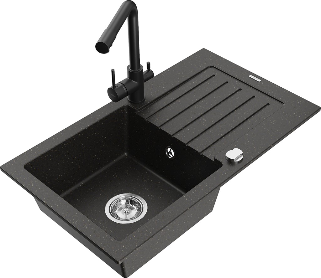 Technické dáta: drez: Rozmer: 752 x 436 x 161 mm Hĺbka komory: 151 mm Rozmery komory: 356x332 mm Priemer odtoku: ø90 mm Typ: 1-miska s odkvapkávačom Typ: Zapustené do pracovnej dosky Farba: čierna / zlatá metalíza Povrchová úprava sifónu: Chrome Materiál: žula (80% žulové kamenivo, 20% živice) Prepadový otvor: Áno Otvory: (batérie, automatické) 2 Inštalácia: Univerzálna, je možné inštalovať s odkvapkávačom na ľavú alebo pravú stranu Vysoká odolnosť proti poškriabaniu a zmene farby Odolnosť proti tepelným šokom Ľahko čistiteľný povrch Dva dodatočné vyfrézované otvory na samodierovanie ø35 kuchynská batéria: Materiál: mosadz Čierna farba Hlava: Keramická Prevzdušňovač: Áno Typ: Dve rukoväte Rozsah výtoku: 235 mm Výška batérie: 315 mm Dvojhlavá batéria s prídavným kanálom pre filtrovanú pitnú vodu(GT) Ean: 5905315024466