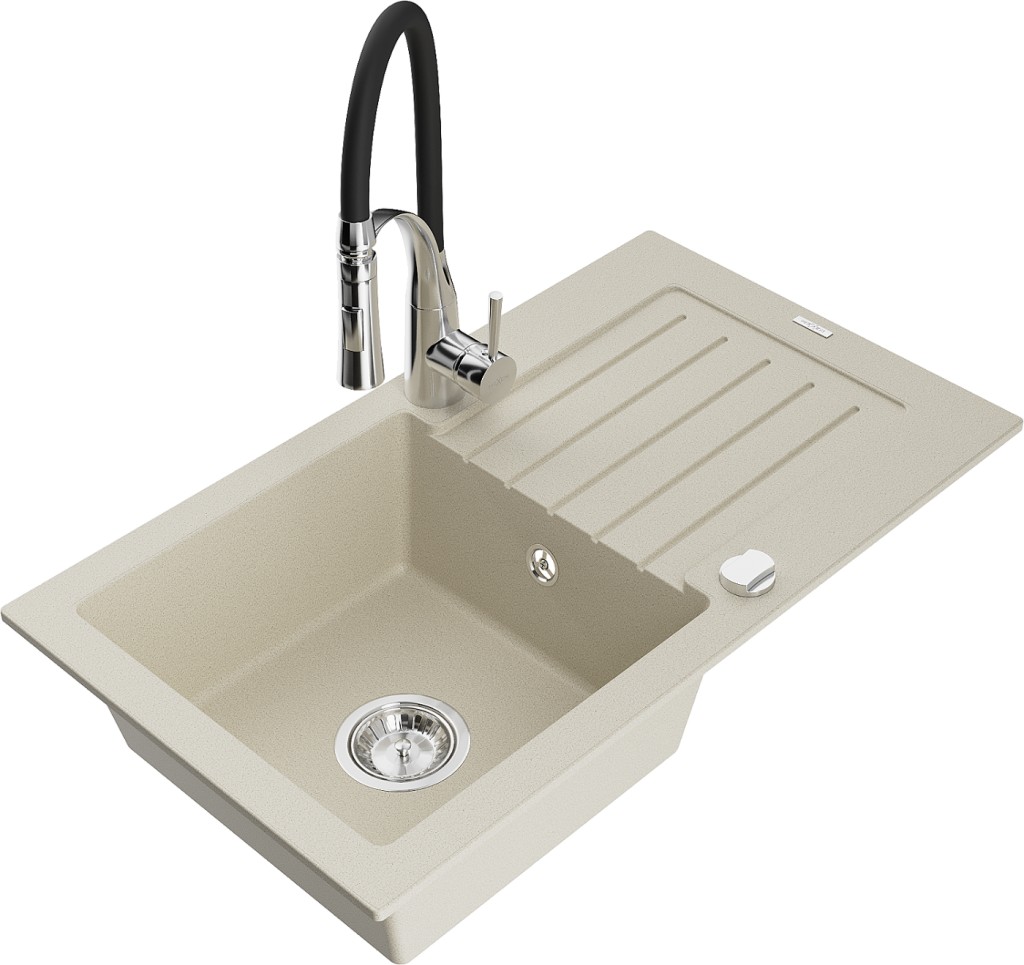Technické dáta: drez: Rozmer: 752 x 436 x 161 mm Hĺbka komory: 151 mm Rozmery komory: 356x332 mm Priemer odtoku: ø90 mm Typ: 1-miska s odkvapkávačom Typ: Zapustené do pracovnej dosky Farba béžová Povrchová úprava sifónu: Chrome Materiál: žula (80% žulové kamenivo, 20% živice) Prepadový otvor: Áno Otvory: (batérie, automatické) 2 Inštalácia: Univerzálna, je možné inštalovať s odkvapkávačom na ľavú alebo pravú stranu Vysoká odolnosť proti poškriabaniu a zmene farby Odolnosť proti tepelným šokom Ľahko čistiteľný povrch Dva dodatočné vyfrézované otvory na samodierovanie ø35 kuchynská batéria: Materiál: mosadz Farba: chróm/čierna Hlava: Keramická Prevzdušňovač: Áno Typ: Jedna páka Výška batérie: 430 mm Rozsah výtoku: 185 mm Batéria má výsuvný výtok(GT) Ean: 5905315045522