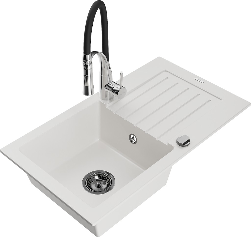 Technické dáta: drez: Rozmer: 752 x 436 x 161 mm Hĺbka komory: 151 mm Rozmery komory: 356x332 mm Priemer odtoku: ø90 mm Typ: 1-miska s odkvapkávačom Typ: Zapustené do pracovnej dosky biela farba Povrchová úprava sifónu: čierna Materiál: žula (80% žulové kamenivo, 20% živice) Prepadový otvor: Áno Otvory: (batérie, automatické) 2 Inštalácia: Univerzálna, je možné inštalovať s odkvapkávačom na ľavú alebo pravú stranu Vysoká odolnosť proti poškriabaniu a zmene farby Odolnosť proti tepelným šokom Ľahko čistiteľný povrch Dva dodatočné vyfrézované otvory na samodierovanie ø35 kuchynská batéria: Materiál: mosadz Farba: chróm/čierna Hlava: Keramická Prevzdušňovač: Áno Typ: Jedna páka Výška batérie: 430 mm Rozsah výtoku: 185 mm Batéria má výsuvný výtok(GT) Ean: 5905315045478