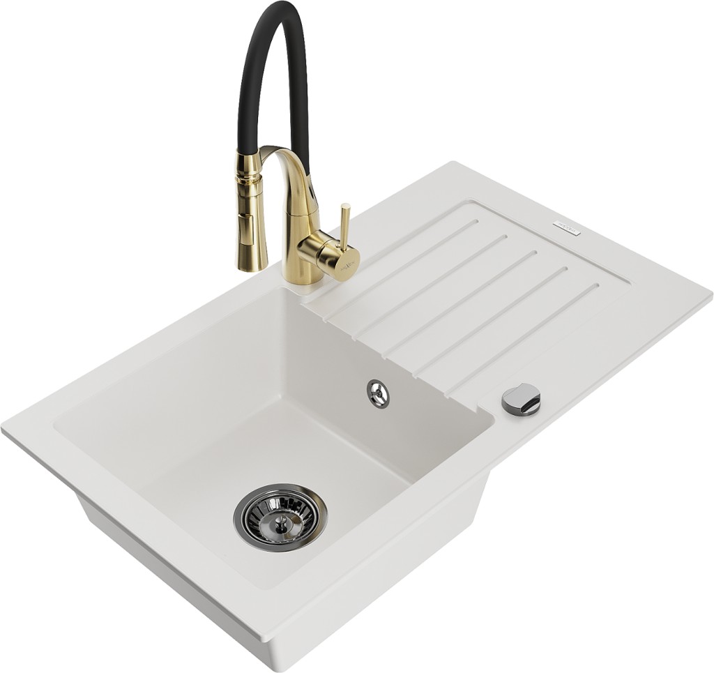 Technické dáta: drez: Rozmer: 752 x 436 x 161 mm Hĺbka komory: 151 mm Rozmery komory: 356x332 mm Priemer odtoku: ø90 mm Typ: 1-miska s odkvapkávačom Typ: Zapustené do pracovnej dosky biela farba Povrchová úprava sifónu: čierna Materiál: žula (80% žulové kamenivo, 20% živice) Prepadový otvor: Áno Otvory: (batérie, automatické) 2 Inštalácia: Univerzálna, je možné inštalovať s odkvapkávačom na ľavú alebo pravú stranu Vysoká odolnosť proti poškriabaniu a zmene farby Odolnosť proti tepelným šokom Ľahko čistiteľný povrch Dva dodatočné vyfrézované otvory na samodierovanie ø35 kuchynská batéria: Materiál: mosadz Farba: Zlatá/Čierna Hlava: Keramická Prevzdušňovač: Áno Typ: Jedna páka Výška batérie: 430 mm Rozsah výtoku: 185 mm Batéria má výsuvný výtok(GT) Ean: 5905315045492