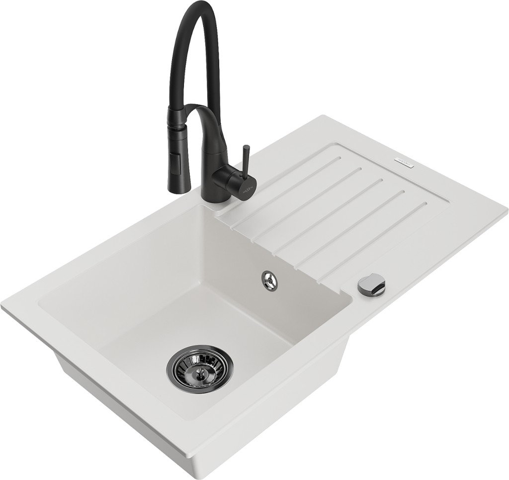 Technické dáta: drez: Rozmer: 752 x 436 x 161 mm Hĺbka komory: 151 mm Rozmery komory: 356x332 mm Priemer odtoku: ø90 mm Typ: 1-miska s odkvapkávačom Typ: Zapustené do pracovnej dosky biela farba Povrchová úprava sifónu: čierna Materiál: žula (80% žulové kamenivo, 20% živice) Prepadový otvor: Áno Otvory: (batérie, automatické) 2 Inštalácia: Univerzálna, je možné inštalovať s odkvapkávačom na ľavú alebo pravú stranu Vysoká odolnosť proti poškriabaniu a zmene farby Odolnosť proti tepelným šokom Ľahko čistiteľný povrch Dva dodatočné vyfrézované otvory na samodierovanie ø35 kuchynská batéria: Materiál: mosadz Čierna farba Hlava: Keramická Prevzdušňovač: Áno Typ: Jedna páka Výška batérie: 430 mm Rozsah výtoku: 185 mm Batéria má výsuvný výtok(GT) Ean: 5905315045508