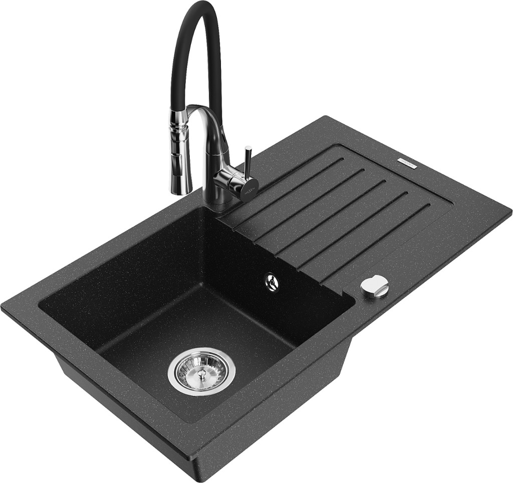 Technické dáta: drez: Rozmer: 752 x 436 x 161 mm Hĺbka komory: 151 mm Rozmery komory: 356x332 mm Priemer odtoku: ø90 mm Typ: 1-miska s odkvapkávačom Typ: Zapustené do pracovnej dosky Farba: čierna/strieborná metalíza Povrchová úprava sifónu: Chrome Materiál: žula (80% žulové kamenivo, 20% živice) Prepadový otvor: Áno Otvory: (batérie, automatické) 2 Inštalácia: Univerzálna, je možné inštalovať s odkvapkávačom na ľavú alebo pravú stranu Vysoká odolnosť proti poškriabaniu a zmene farby Odolnosť proti tepelným šokom Ľahko čistiteľný povrch Dva dodatočné vyfrézované otvory na samodierovanie ø35 kuchynská batéria: Materiál: mosadz Farba: chróm/čierna Hlava: Keramická Prevzdušňovač: Áno Typ: Jedna páka Výška batérie: 455 mm Rozsah výtoku: 185 mm Batéria má výsuvný výtok(GT) Ean: 5905315045645