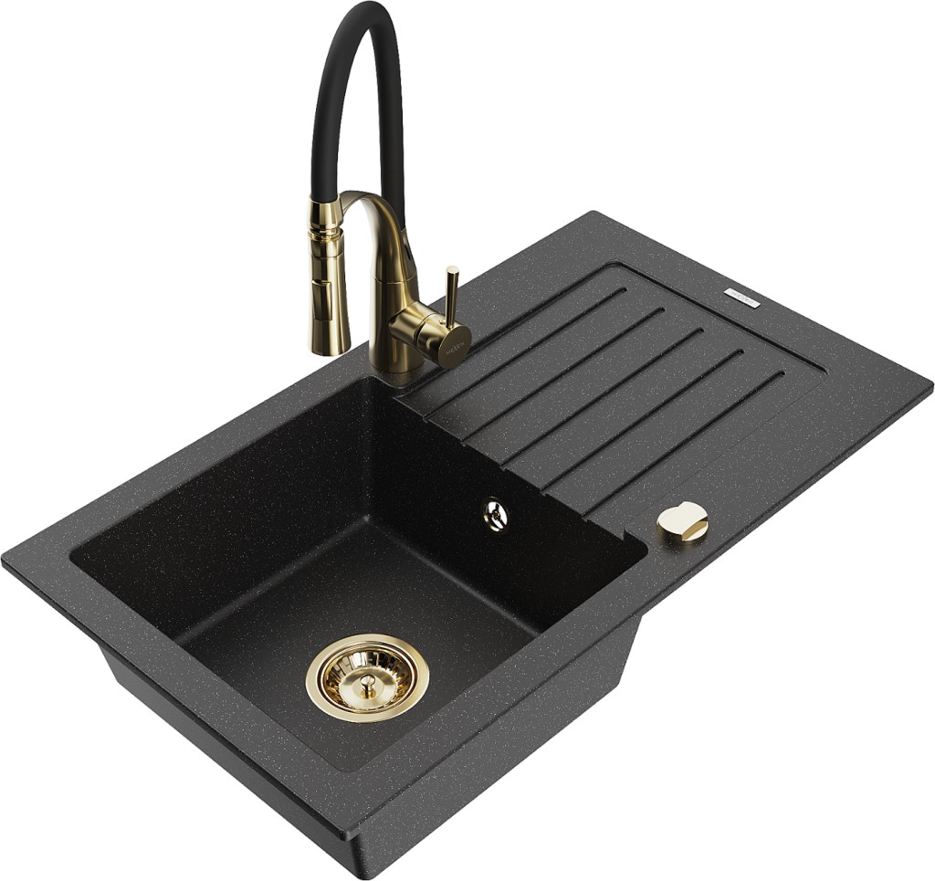 Technické dáta: drez: Rozmer: 752 x 436 x 161 mm Hĺbka komory: 151 mm Rozmery komory: 356x332 mm Priemer odtoku: ø90 mm Typ: 1-miska s odkvapkávačom Typ: Zapustené do pracovnej dosky Farba: čierna/strieborná metalíza Povrchová úprava sifónu: zlatá Materiál: žula (80% žulové kamenivo, 20% živice) Prepadový otvor: Áno Otvory: (batérie, automatické) 2 Inštalácia: Univerzálna, je možné inštalovať s odkvapkávačom na ľavú alebo pravú stranu Vysoká odolnosť proti poškriabaniu a zmene farby Odolnosť proti tepelným šokom Ľahko čistiteľný povrch Dva dodatočné vyfrézované otvory na samodierovanie ø35 kuchynská batéria: Materiál: mosadz Farba: Zlatá/Čierna Hlava: Keramická Prevzdušňovač: Áno Typ: Jedna páka Výška batérie: 430 mm Rozsah výtoku: 185 mm Batéria má výsuvný výtok(GT) Ean: 5905315045669