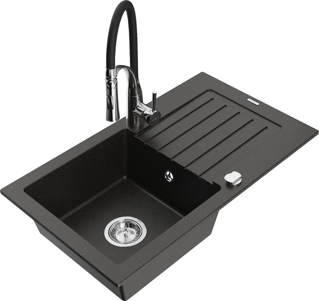 Technické dáta: drez: Rozmer: 752 x 436 x 161 mm Hĺbka komory: 151 mm Rozmery komory: 356x332 mm Priemer odtoku: ø90 mm Typ: 1-miska s odkvapkávačom Typ: Zapustené do pracovnej dosky Farba: čierna / zlatá metalíza Povrchová úprava sifónu: Chrome Materiál: žula (80% žulové kamenivo, 20% živice) Prepadový otvor: Áno Otvory: (batérie, automatické) 2 Inštalácia: Univerzálna, je možné inštalovať s odkvapkávačom na ľavú alebo pravú stranu Vysoká odolnosť proti poškriabaniu a zmene farby Odolnosť proti tepelným šokom Ľahko čistiteľný povrch Dva dodatočné vyfrézované otvory na samodierovanie ø35 kuchynská batéria: Materiál: mosadz Farba: chróm/čierna Hlava: Keramická Prevzdušňovač: Áno Typ: Jedna páka Výška batérie: 430 mm Rozsah výtoku: 185 mm Batéria má výsuvný výtok(GT) Ean: 5905315045706