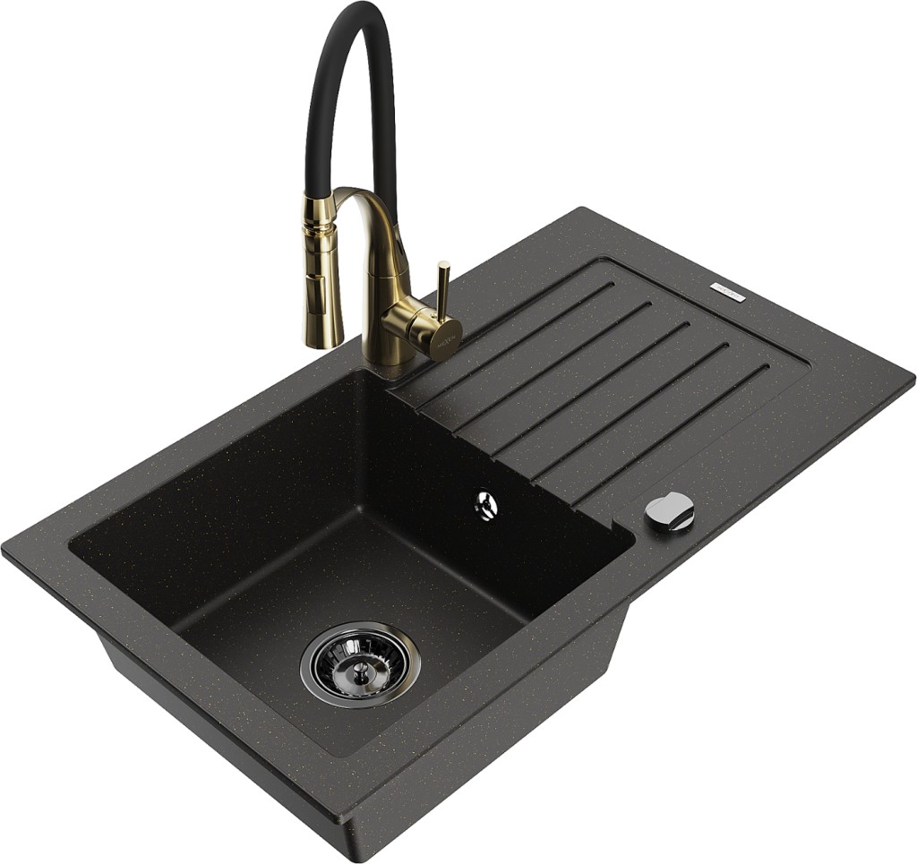 Technické dáta: drez: Rozmer: 752 x 436 x 161 mm Hĺbka komory: 151 mm Rozmery komory: 356x332 mm Priemer odtoku: ø90 mm Typ: 1-miska s odkvapkávačom Typ: Zapustené do pracovnej dosky Farba: čierna / zlatá metalíza Povrchová úprava sifónu: čierna Materiál: žula (80% žulové kamenivo, 20% živice) Prepadový otvor: Áno Otvory: (batérie, automatické) 2 Inštalácia: Univerzálna, je možné inštalovať s odkvapkávačom na ľavú alebo pravú stranu Vysoká odolnosť proti poškriabaniu a zmene farby Odolnosť proti tepelným šokom Ľahko čistiteľný povrch Dva dodatočné vyfrézované otvory na samodierovanie ø35 kuchynská batéria: Materiál: mosadz Farba: Zlatá/Čierna Hlava: Keramická Prevzdušňovač: Áno Typ: Jedna páka Výška batérie: 430 mm Rozsah výtoku: 185 mm Batéria má výsuvný výtok(GT) Ean: 5905315045737