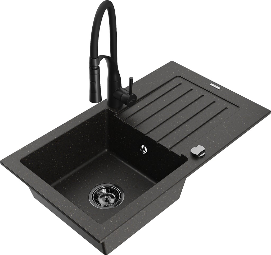 Technické dáta: drez: Rozmer: 752 x 436 x 161 mm Hĺbka komory: 151 mm Rozmery komory: 356x332 mm Priemer odtoku: ø90 mm Typ: 1-miska s odkvapkávačom Typ: Zapustené do pracovnej dosky Farba: čierna / zlatá metalíza Povrchová úprava sifónu: čierna Materiál: žula (80% žulové kamenivo, 20% živice) Prepadový otvor: Áno Otvory: (batérie, automatické) 2 Inštalácia: Univerzálna, je možné inštalovať s odkvapkávačom na ľavú alebo pravú stranu Vysoká odolnosť proti poškriabaniu a zmene farby Odolnosť proti tepelným šokom Ľahko čistiteľný povrch Dva dodatočné vyfrézované otvory na samodierovanie ø35 kuchynská batéria: Materiál: mosadz Čierna farba Hlava: Keramická Prevzdušňovač: Áno Typ: Jedna páka Výška batérie: 430 mm Rozsah výtoku: 185 mm Batéria má výsuvný výtok(GT) Ean: 5905315045744
